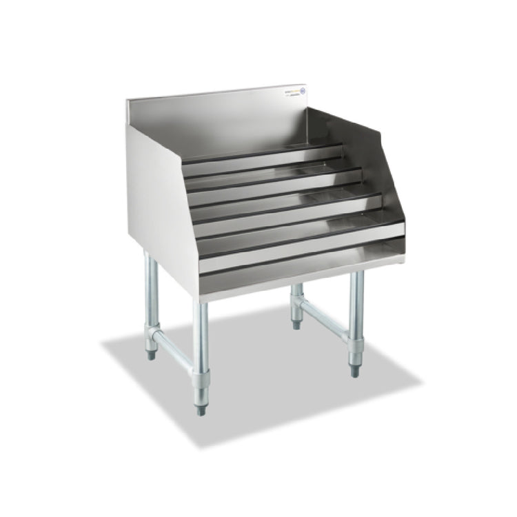 Steel Works Stainless, SWLDR-1824, Underbar Raised Liquor bottle Display Unit, 24" x 18", 36orking height, 20/304 stainless steel construction, 6" backsplash, (12) bottle capacity, Guard Rails on Each Step, stainless steel legs, Cross bracing & Bullet Feet
