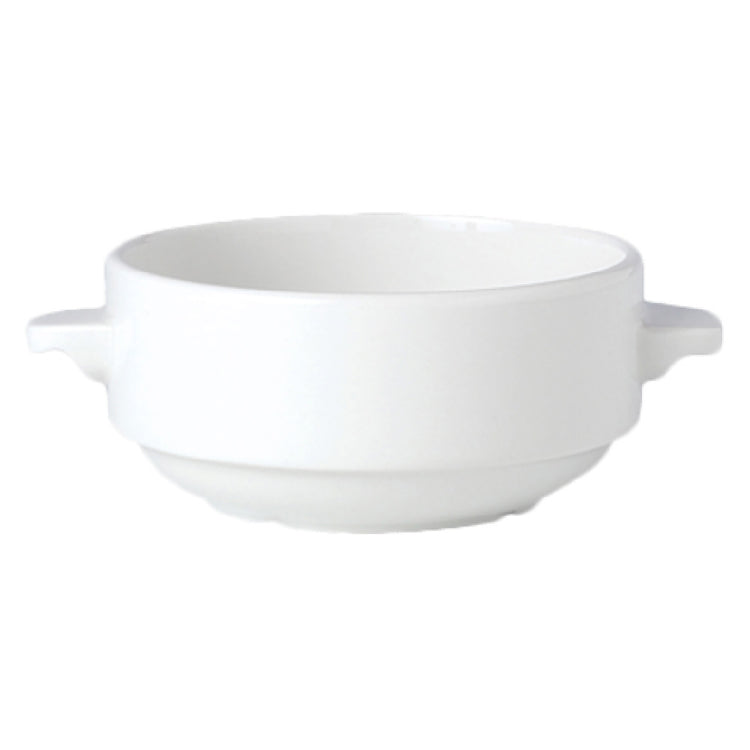 The Steelite 11010115 Soup Cup is a versatile dining essential, offering a generous 10 oz. capacity for a variety of culinary presentations. With dimensions of 5-5/8" in width and 2" in height, this soup cup is designed for convenience and efficiency in both preparation and service. Featuring lug handles, it ensures easy handling and transport, a valuable asset in high-paced environments like restaurants and catering services. The stackable design allows for efficient space utilization, enhancing storage capabilities in commercial kitchens. Made from fully vitrified ceramic, the Steelite 11010115 is not only durable but also resistant to temperature fluctuations, making it safe for use in refrigerators, freezers, microwaves, and dishwashers. The pristine white finish complements any table setting, embodying the Steelite Performance and Simplicity ranges' commitment to quality and aesthetic appeal. Available as a stock item and packed by 3 dozen per case, it is an ideal option for businesses that prioritize functionality and style. This soup cup's robust construction and versatile design make it a practical choice for a wide range of markets, from hospitality to catering, where reliability and elegance are paramount.
