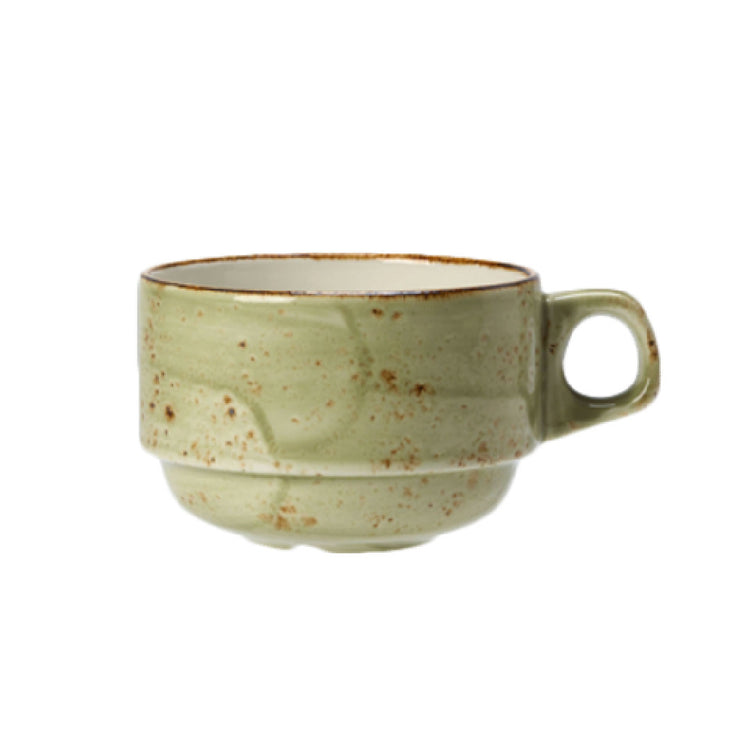 The Steelite 11310188 Slimline Cup, with a capacity of 10 oz., is a versatile and practical choice for various dining settings. Measuring 5 inches in diameter and 2-1/2 inches in height, this cup is designed for comfortable handling and easy stacking, making it an efficient space-saving solution. Suitable for both casual and formal occasions, the cup's vitrified ceramic construction is a testament to Steelite's commitment to durability and quality. It is part of the Steelite Performance collection, offering exceptional resistance to thermal and mechanical shocks. The cup is freezer, microwave, and dishwasher safe, providing convenience and versatility in food service operations. Its lifetime edge chip warranty ensures long-lasting performance, making it a reliable choice for high-volume establishments. The Craft Green color adds a touch of elegance and sophistication to the table, complementing various interior styles. Packed by 3 dozen per case, it caters to the needs of restaurants, hotels, and catering services looking for a dependable and stylish beverage ware solution. The Steelite 11310188 Slimline Cup is a stock item, allowing for immediate availability to meet the demands of the food service industry efficiently.