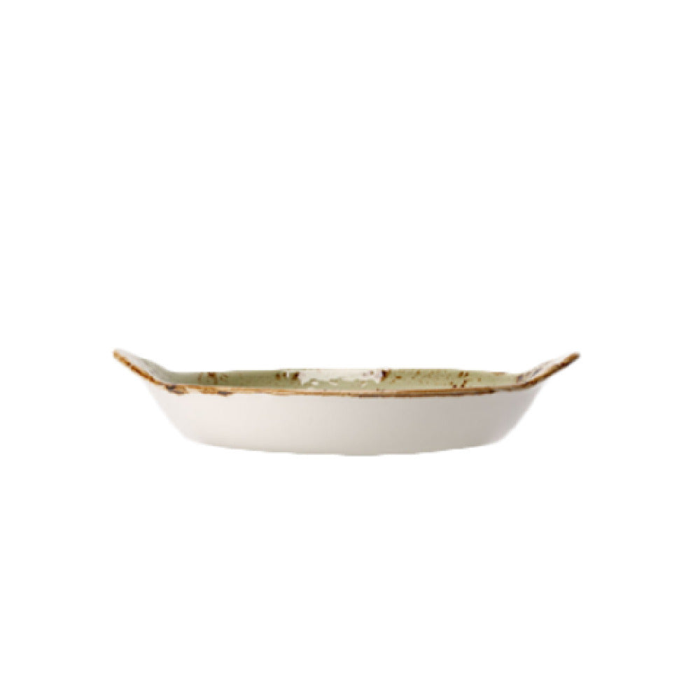 The Steelite 11310317 Eared Dish 27-1/2 Oz. 8-1/2" Dia. is a practical and versatile choice for both professional and home kitchens, designed to meet diverse culinary needs with its impressive specifications. The dish boasts a capacity of 27-1/2 oz., making it suitable for serving generous portions, and measures 8-1/2 inches in diameter to fit standard serving requirements. Made from vitrified ceramic, it ensures enhanced durability and minimal porosity, reducing the risk of absorption and staining. A standout feature is its lifetime edge chip warranty, offering a guarantee of lasting quality and reliability. The dish is part of the Steelite Performance collection, known for its robustness and exceptional performance in demanding environments. Its Craft Green finish adds an appealing aesthetic, making it ideal for stylish presentations. Functionally, this eared dish is freezer, microwave, and dishwasher safe, providing convenience and efficiency in a variety of settings. It comes packed by the dozen, catering to bulk needs for restaurants, catering businesses, or large family gatherings. The combination of durability, practicality, and style makes the Steelite 11310317 Eared Dish a valuable addition to any dining establishment or culinary enthusiast's collection.