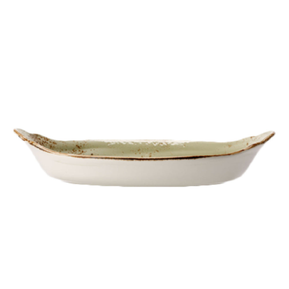 The Steelite 11310320 Eared Dish is a versatile piece designed for both professional kitchens and home culinary enthusiasts. This dish features a capacity of 27-1/2 oz., with dimensions of 12" x 6-1/2", making it ideal for serving a variety of dishes. Its oval shape adds a touch of elegance, suitable for upscale dining presentations. Constructed from vitrified ceramic, the dish ensures durability and longevity, even under heavy use. Its robust composition offers assurances through a lifetime edge chip warranty, highlighting its resistance to everyday wear and tear. The Steelite 11310320 Eared Dish is part of the Steelite Performance collection, showcasing high-performance attributes, including being freezer, microwave, and dishwasher safe, thus catering to diverse kitchen needs and easing the process of meal preparation and cleanup. The dish's Craft Green finish adds a distinctive aesthetic appeal, setting it apart in any dining setting. Although it is a non-stock item, it is available packed by 1 dozen, making it a pragmatic choice for restaurants and catering services aiming to maintain a cohesive and stylish table setting. The Steelite 11310320 Eared Dish seamlessly combines functionality with refined design, meeting the demands of different market segments within the food service industry.