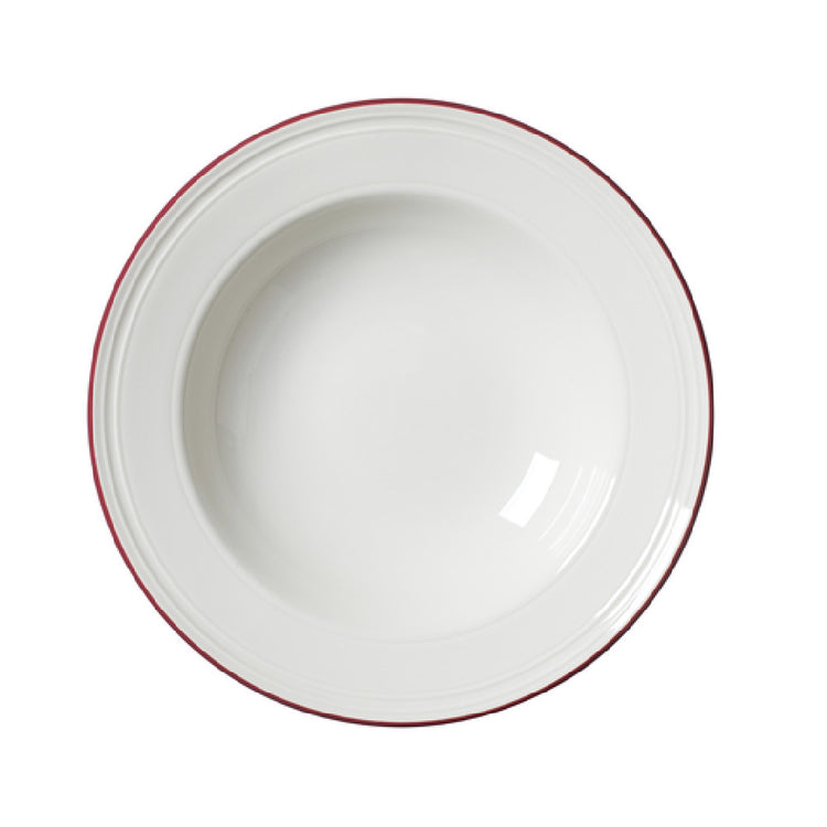 The Steelite 1407X0123 Soup/Pasta Plate is a meticulously designed piece of dinnerware, perfect for both commercial and residential use in various dining settings. With a generous capacity of 16 ounces, this 9-1/2 inch diameter plate is ideally suited for serving soups, pastas, and other culinary creations. Made from fully vitrified ceramic, it ensures exceptional durability and resistance to chipping and cracking. The plate is designed to be freezer, microwave, and dishwasher safe, making it a versatile choice for busy kitchens and food service environments. It features the distinct Steelite Performance, renowned for its high-quality products that stand up to rigorous daily use. The plate is adorned with a Bead Maroon Band, offering a subtle touch of elegance to its classic white finish. Although it is a non-stock item, it is packed by the dozen, catering to the needs of larger establishments. The Steelite 1407X0123 plate blends functionality with style, providing a reliable and aesthetically pleasing option for restaurants, catering services, and hospitality establishments seeking to enhance their tableware collection with durable and visually appealing pieces.