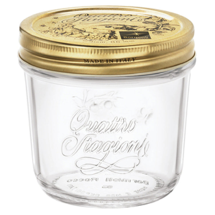 The Steelite 4951Q533 Stagioni Straight Jar 6-3/4 Oz. (H 3-3/8" M 3-1/2" T 3-1/4" B 2-1/2") Clear is a versatile storage solution suitable for various segment markets within the food and hospitality industry. Manufactured by Bormioli Rocco as part of the Quattro Stagioni collection, this jar combines functionality with aesthetic appeal. The jar has a capacity of 6-3/4 ounces, making it ideal for storing small quantities of food products, spices, or condiments. Its dimensions are carefully designed for optimal space efficiency, with a height of 3-3/8 inches, a middle diameter of 3-1/2 inches, a top diameter of 3-1/4 inches, and a base diameter of 2-1/2 inches. Made from clear glass, the jar allows for easy identification of contents, enhancing usability in busy kitchen environments. The inclusion of a metal lid ensures a secure seal, preserving the freshness of stored items. As a stock item, it is readily available for purchase in packs of one dozen, making it a practical choice for businesses looking to maintain consistent inventory levels. The Steelite 4951Q533 Stagioni Straight Jar is a reliable and elegant option for various storage needs.