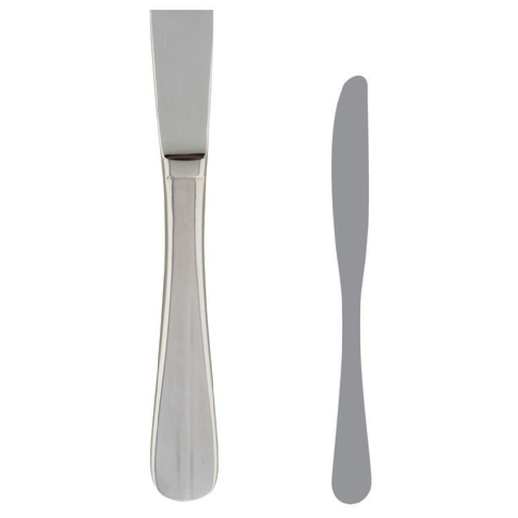 The Steelite 5300S051 Dessert Knife 8-1/2" Solid Handle is an expertly crafted piece designed for elegance and durability in various dining settings. Measuring 8-1/2 inches, this dessert knife features a solid handle, offering a comfortable and balanced grip that enhances the dining experience. Constructed from 13/0 stainless steel, this knife is not only resistant to rust and corrosion but also offers a sleek and polished appearance that complements any table setting. The WNK designation in its construction signifies a proprietary blend of stainless steel, ensuring long-lasting sharpness and improved resistance to wear. As part of the Baguette line, this dessert knife boasts a classic and timeless design, perfect for upscale restaurants, banquet halls, or catering services that prioritize both form and function. Ideal for dessert courses, this knife combines precision cutting with an aesthetically pleasing design, making it suitable for a variety of dessert presentations. As a stock item from Steelite International, it assures availability and consistency for establishments that demand high-quality flatware. The Steelite 5300S051 Dessert Knife is a versatile addition to any culinary establishment, offering both practicality and style to enhance the overall dining experience.