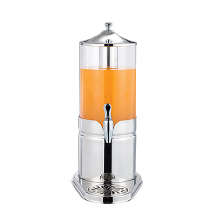 The Steelite 5370S495 Juice Dispenser Single 5-1/4 Qt. is a meticulously crafted beverage solution, tailored for high-demand environments such as hotels, restaurants, and catering services. Featuring a capacity of 5-1/4 quarts, this dispenser is ideal for serving a variety of juices, ensuring guests always have fresh refreshments available. Its dimensions are precisely measured at 9 inches by 14-3/8 inches by 9-1/4 inches, providing a compact yet efficient design suitable for buffet settings. Constructed with an 18/10 stainless steel base, this dispenser guarantees durability and resistance to corrosion, making it a long-lasting addition to any service setup. The WNK Buffet collection, to which this dispenser belongs, is renowned for integrating functionality with aesthetic appeal, enhancing the visual experience of any culinary display. Stocked as a single unit, it offers ease of handling and placement, meeting the operational needs of various service industries. Its thoughtful design and robust construction make it an invaluable asset, ensuring reliability and quality in beverage presentation across diverse market segments. Packed as a single item, it simplifies inventory management while maintaining high standards in service and presentation.