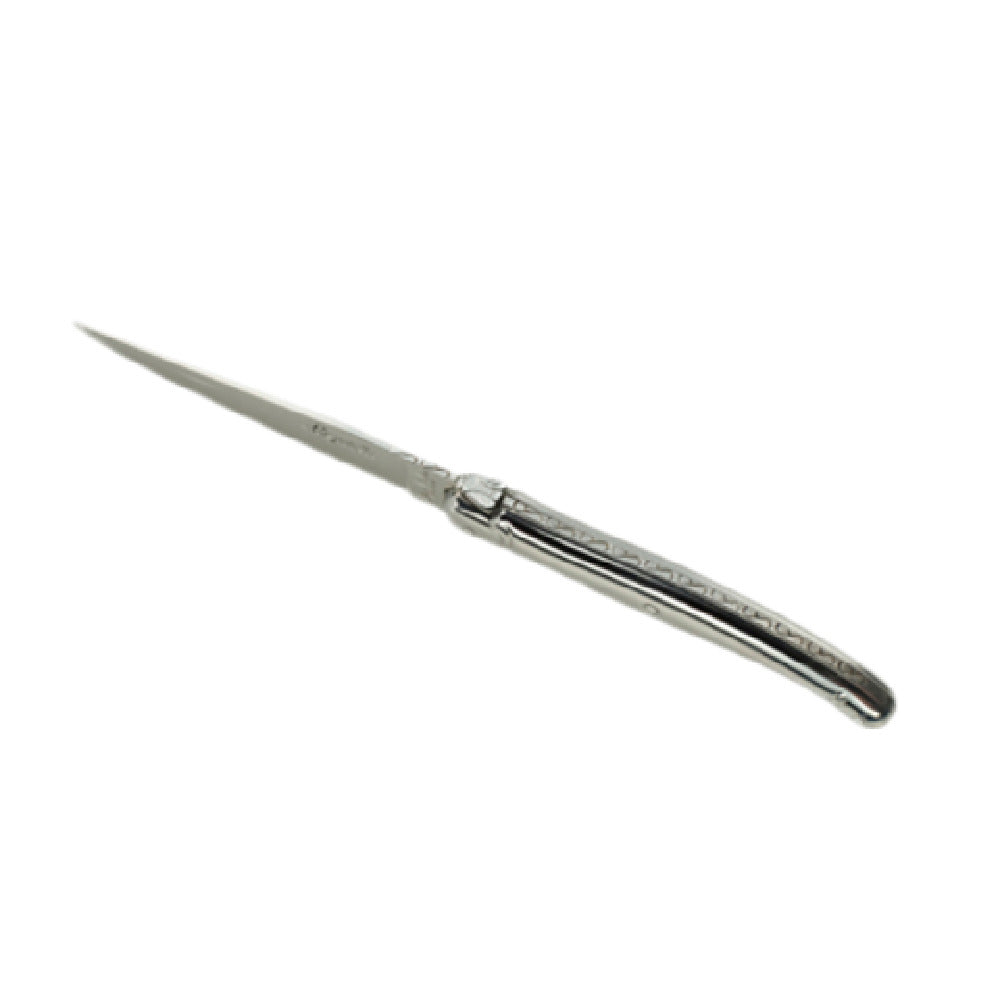 The Steelite 5390S079 Steak Knife 9"-2.5 Mm is a precision-crafted utensil designed for both professional and home culinary settings, renowned for its exceptional quality and performance. Manufactured by Jean Dubost, this steak knife features a 9-inch blade with a thickness of 2.5 mm, offering a perfect balance of strength and finesse for cutting through steaks with ease. The blade is sharpened with guill, ensuring a clean cut every time, enhancing the dining experience. Crafted from 13/0 stainless steel, the handle provides a robust and corrosion-resistant grip, maintaining its integrity and shine even after extensive use. The Laguiole-style design adds a touch of elegance and tradition, making it a favored choice among connoisseurs and chefs alike. Sold in packs of six, this stock item meets the demands of restaurants, catering services, and hospitality businesses seeking reliable and aesthetically pleasing cutlery solutions. The Steelite 5390S079 Steak Knife's combination of durability, precision, and elegant design makes it a versatile tool that meets the requirements of various market segments within the culinary industry, from high-end steakhouses to luxury dining events.