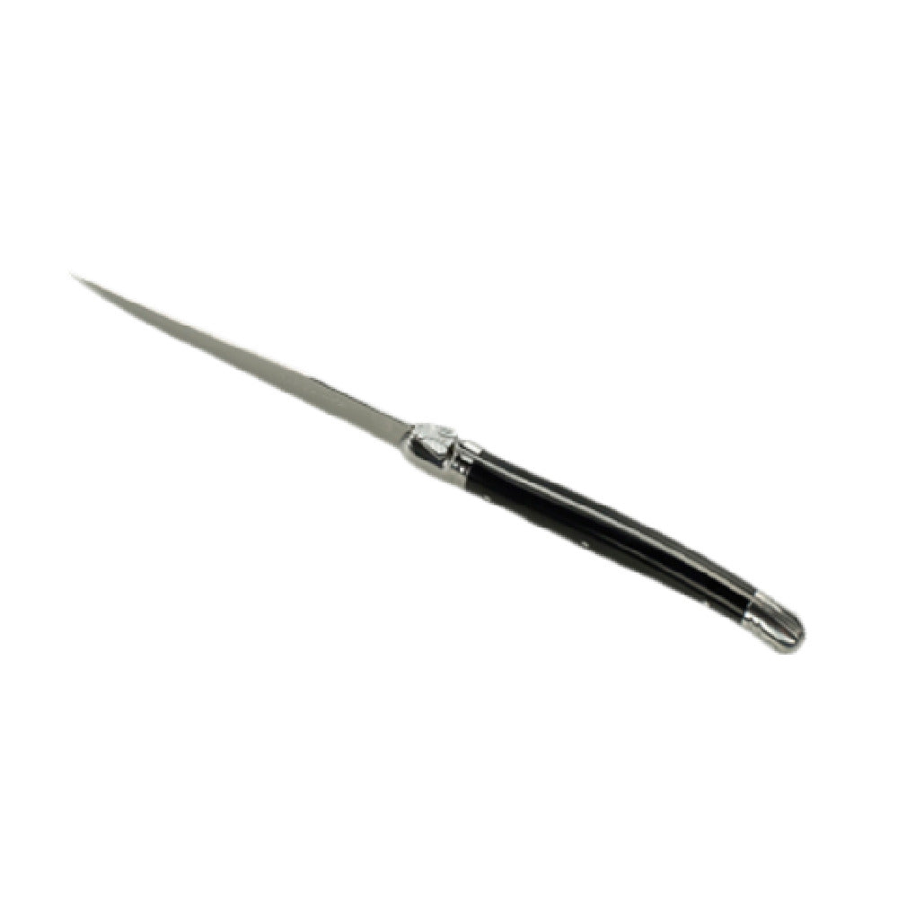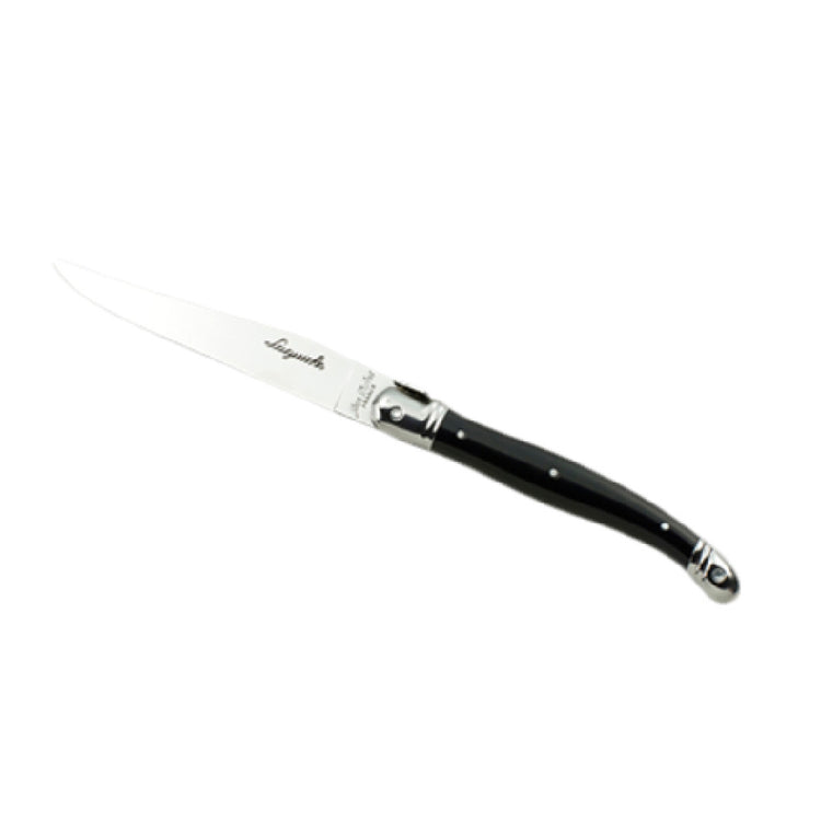 The Steelite 5392S077 Steak Knife 9" 1.5 Mm is a premium cutting tool, specially crafted for precision and durability in the culinary industry. This steak knife features a 9-inch blade that is meticulously sharpened for effortless slicing through meat, enhancing the dining experience for end-users. The blade is constructed from high-quality 13/0 stainless steel, known for its remarkable resistance to staining and corrosion, ensuring long-lasting sharpness and performance. Designed by the renowned Jean Dubost in the Laguiole Black style, this knife exudes elegance and sophistication with its black curved handle. The ergonomic handle design provides a comfortable and secure grip, making it suitable for both professional chefs and home cooks who value both form and function. Each pack contains six knives, offering great value for restaurants and catering businesses looking to equip their kitchens with high-quality cutlery. The combination of aesthetic appeal and superior technical specifications makes the Steelite 5392S077 Steak Knife an exceptional choice for those within the culinary sector who demand reliability and excellence in their kitchen tools.
