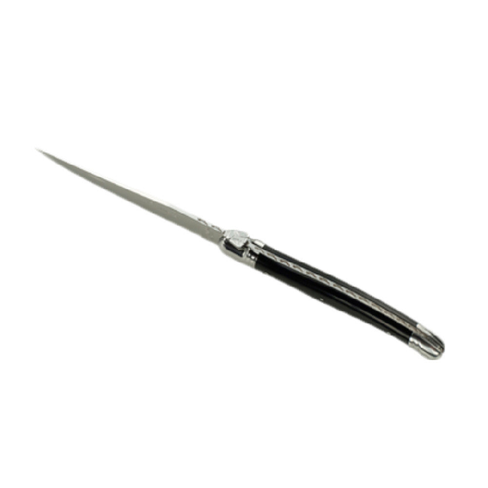 The Steelite 5392S079 Steak Knife 9" 2.5 mm is a premium quality utensil crafted for precision and style. Measuring 9 inches in length with a blade thickness of 2.5 mm, this steak knife is expertly sharpened to ensure effortless slicing through various cuts of meat. The knife is constructed from 13/0 stainless steel, a material known for its strength and resistance to corrosion, ensuring durability and longevity for professional and home use. A distinctive feature of this knife is its elegant black curved handle adorned with a guilloche pattern, offering both an ergonomic grip and a sophisticated aesthetic. Manufactured by Jean Dubost, the knife is part of the renowned Laguiole Black series, synonymous with excellence and traditional French craftsmanship. Packaged as a stock item in sets of six, this steak knife is ideal for upscale dining establishments seeking to enhance the dining experience with superior cutlery. It is also suitable for culinary enthusiasts who appreciate the combination of functionality and design. The Steelite 5392S079 Steak Knife embodies a perfect balance of form and function, making it a valuable addition for chefs and gastronomes dedicated to high-quality tableware.