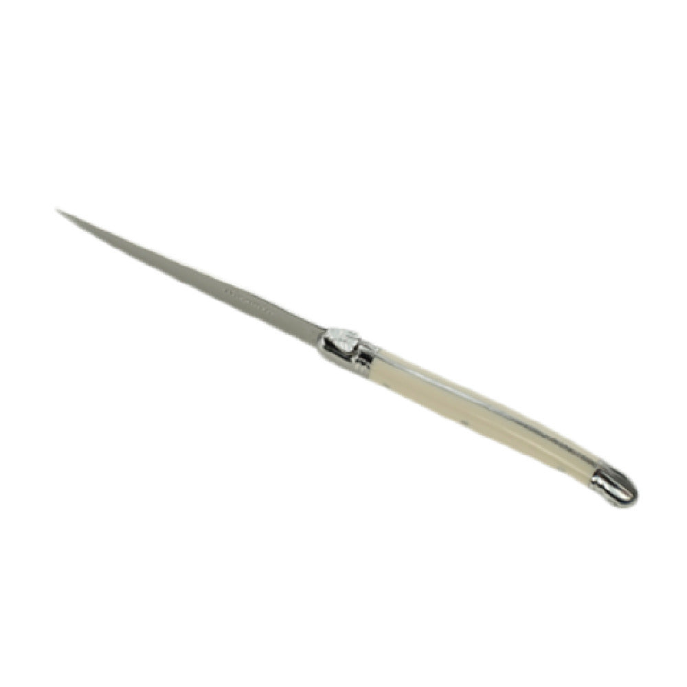 The Steelite 5393S077 Steak Knife 9" 1.5 Mm is a refined culinary tool designed to enhance the dining experience in both professional and home settings. Crafted with precision, this steak knife features a 9-inch blade that is sharpened to ensure precise cuts, making it an essential utensil for any steak lover. The blade is constructed from 13/0 stainless steel, a material known for its resistance to corrosion and staining, ensuring durability and long-lasting performance. The ABS ivory handle not only adds a touch of elegance but also provides a comfortable grip for effortless handling. Originating from the esteemed Jean Dubost Laguiole collection, this knife embodies the craftsmanship and quality associated with French cutlery tradition. Packaged in sets of six, it is an ideal choice for restaurants looking to elevate their table settings or for individuals who appreciate high-quality kitchenware. The Steelite 5393S077 Steak Knife is particularly valued in the hospitality industry for its combination of aesthetic appeal and functional efficiency, making it a worthwhile investment for enhancing both the presentation and enjoyment of fine dining experiences.