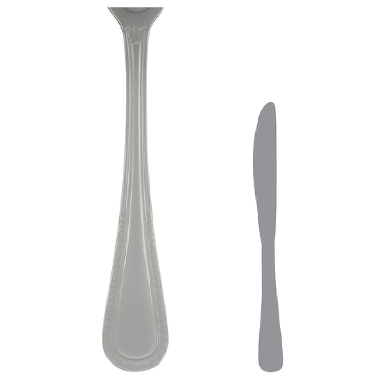 The Steelite 5711SX045 Butter Knife is a 7-1/4 inch utensil crafted from 13/0 stainless steel, prominently featured within the Varick Flatware line under the Triumph collection. Notable for its combination of functionality and aesthetic appeal, this butter knife is a stock item formerly branded under Cortland Silversmith, ensuring a legacy of quality and precision in its craftsmanship. The 13/0 stainless steel composition offers a balance of durability and corrosion resistance, tailored to meet the rigorous demands of both casual dining and formal culinary settings. Its design caters to a range of industry segments, including hospitality, catering, and home dining, making it a versatile addition to any flatware collection. The Steelite 5711SX045 is engineered for ease of use and maintenance, its sturdy construction allowing for long-term usability in high-traffic environments. Whether enhancing a restaurant's table setting or enriching a home dining experience, this butter knife underscores Steelite's commitment to superior flatware solutions, merging traditional craftsmanship with modern usability. The Steelite 5711SX045 Butter Knife stands as a testament to fine dining efficiency and elegance, making it an indispensable tool for professionals and enthusiasts alike.