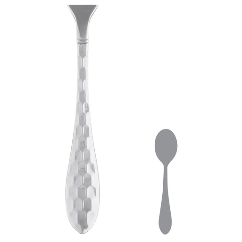 The Steelite 5714SX005 Demitasse Spoon - 4-1/2" is an embodiment of durable elegance, crafted from 18/0 stainless steel, which is known for its resilience and affordability. This heavy-weight spoon is designed with a honeycomb hammered finish, adding a touch of sophistication and visual appeal, ideal for upscale dining environments. Part of the Varick Flatware collection, specifically the Crystal line, this spoon maintains a stylish yet functional aesthetic that complements a variety of table settings. Formerly under the Cortland Silversmith brand, this demitasse spoon measures 4-1/2 inches, making it the perfect size for enjoying espresso, small desserts, or delicate appetizers. Its robust construction ensures longevity and resistance to bending, catering to high-volume restaurants, cafes, and catering services that prioritize both design and durability. The Steelite 5714SX005 stands out in its category, offering a balance of intricate design and practical utility, making it a versatile addition to any establishment seeking to enhance their flatware collection with a piece that is both cost-effective and visually striking.