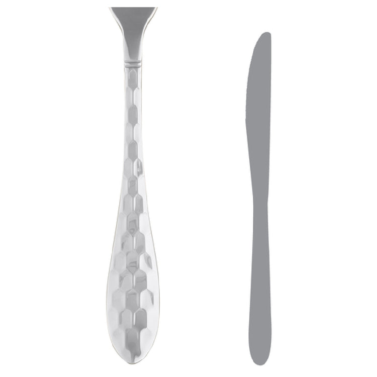 The Steelite 5714SX042 Table Knife 9-1/8" is crafted from 13/0 stainless steel heavy weight, renowned for its durability and resistance to corrosion, making it a reliable choice for both domestic and commercial dining settings. This table knife is part of the Varick Flatware collection and features a distinctive honeycomb hammered finish, providing a sophisticated touch that complements a variety of table settings. Formerly branded under Cortland Silversmith, this piece retains a legacy of exceptional craftsmanship and design. The 9-1/8" length is ideal for a comfortable grip and efficient cutting, catering to the needs of diners across multiple segments, from upscale restaurants to casual eateries. Its heavy weight construction offers a premium feel, enhancing the dining experience through both aesthetics and functionality. As a stock item, the Steelite 5714SX042 ensures consistent availability, making it a practical choice for businesses requiring dependable supply and quality. This table knife blends traditional elegance with modern durability, appealing to those in the food service industry who value both style and performance in their flatware selections.