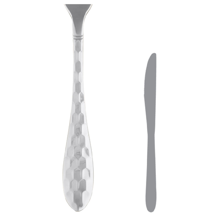 The Steelite 5714SX045 Butter Knife - 7-1/2" is crafted from 13/0 stainless steel, ensuring durability and a heavyweight feel ideal for both professional culinary settings and elegant dining experiences. This butter knife, part of the Varick Flatware collection, features a distinctive honeycomb hammered finish that adds a touch of sophistication and uniqueness to any table setting. Known for its quality, Steelite International's craftsmanship shines in this utensil, previously branded under the Cortland Silversmith name, indicating a legacy of excellence. The 7-1/2" length of the knife provides a comfortable balance for spreading and slicing with ease, while the heavyweight construction offers a reassuring sturdiness in hand. This stock item combines aesthetic appeal with functionality, making it a preferred choice in the hospitality industry, from upscale restaurants to high-end catering services. The Steelite 5714SX045 Butter Knife is not only a practical tool but also a stylish addition to any cutlery collection, enhancing the dining experience for both hosts and guests. Its robust design ensures longevity, while the unique finish highlights its suitability for settings that demand both practicality and elegance.