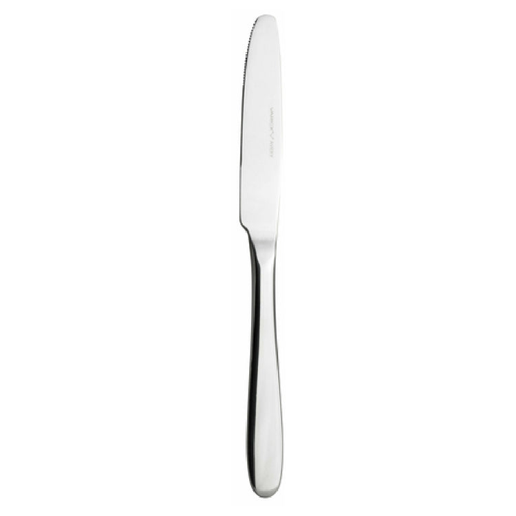 The Steelite 5723SX042 Dinner Knife - 9-1/8" 13/0 Stainless Steel is a meticulously crafted utensil, embodying both functionality and elegance, suitable for a variety of dining environments. Constructed from high-quality 13/0 stainless steel, this dinner knife is part of the Varick Flatware collection, specifically from the Avery line, known for its durability and resistance to corrosion. Measuring at 9-1/8 inches, the Steelite 5723SX042 is designed to provide a comfortable grip and an optimal balance, enhancing the dining experience. Its sleek design and superior material make it an ideal choice for different market segments, including upscale restaurants, hospitality services, and residential dining. As a stock item, it is readily available to meet the demands of both large and small establishments seeking reliability and style in their tableware. The technical features of the Steelite 5723SX042 Dinner Knife ensure a premium quality product that aligns with industry standards, offering a seamless addition to any cutlery collection while maintaining its aesthetic appeal and practical use.