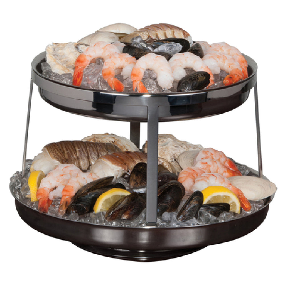 The Steelite 5850JX01 Seafood Stand - 2-tier 12" Dia. & 10" Dia. presents an ideal serving solution for upscale culinary presentations, particularly in seafood dining environments. This seafood stand features two tiers, with dimensions of 12 inches and 10 inches in diameter, respectively, allowing for an elegant display of various seafood assortments. The straight-sided design ensures stability and balance, making it a reliable choice for bustling restaurant settings or catered events. A notable feature includes the removable drain plates, which facilitate seamless drainage and ease of cleaning, thereby enhancing functionality in high-demand food service operations. Crafted from durable Williamsburg Metal, this seafood stand is both aesthetically pleasing and built to withstand the rigors of frequent use. As a stock item, it is readily available for single-unit purchase, accommodating businesses of all sizes. Perfect for fine dining establishments, luxury buffets, or exclusive events, the Steelite 5850JX01 Seafood Stand combines practicality with sophistication, making it a valuable addition to any professional culinary setup.