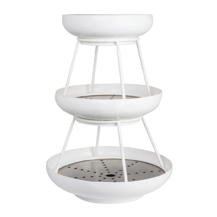 The Steelite 5862JX61 Seafood Stand 3-tier 11-1/2" is a sophisticated and functional addition to any culinary setting, offering a dynamic presentation solution for seafood. With its three-tier design, the stand measures 11-1/2", 9-1/2", and 7-7/8" across its tiers, culminating in an overall height of 17". This feature allows for a visually appealing display of various seafood offerings, enhancing the dining experience. Constructed with a coupe, the stand includes removable drain plates, providing practicality in maintenance and ensuring optimal presentation by preventing water accumulation. The straight side design adds to its modern aesthetic, making it suitable for upscale dining environments. Crafted from durable metal and finished in a sleek white Williamsburg Metal color, this seafood stand is both a sturdy and stylish choice. Ideal for restaurants, hotels, and catering services, the Steelite 5862JX61 meets the diverse needs of the food service industry with its versatile and high-quality construction. As a stock item, it is conveniently packed by 1 each, ensuring ease of purchase and integration into existing dining setups. The Steelite 5862JX61 Seafood Stand is an exemplar of design meeting functionality, tailored for establishments prioritizing both style and efficiency.