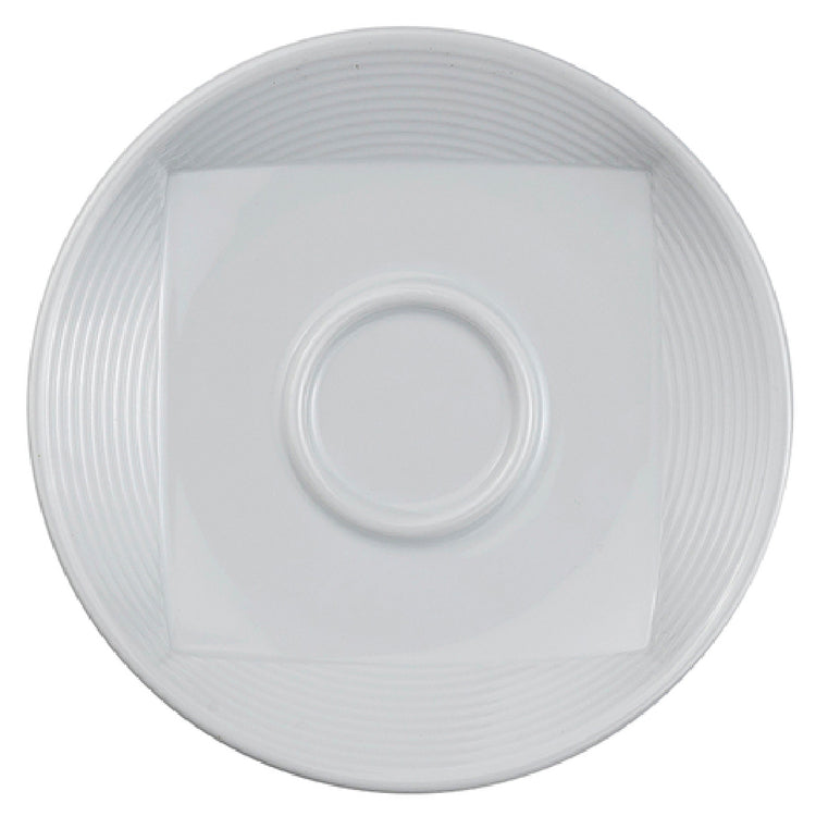 The Steelite 61105ST0536 A.D. Saucer 4-3/4" Dia. Round is a meticulously crafted porcelain saucer, perfect for various dining settings. With a diameter of 4-3/4 inches, this round saucer features a unique square well design that complements its elegant embossed pattern. Made from high-quality Royal Porcelain, it belongs to the Vortex collection, known for its durability and sophisticated aesthetics. This saucer is specifically designed to fit seamlessly with the Steelite model 61105ST0536, ensuring a cohesive table presentation. Although a non-stock item, it is available in practical packaging of three dozen per case, making it an efficient choice for restaurants, catering services, and hospitality venues that require bulk purchasing. Its robust construction and visual appeal make it suitable for upscale dining environments, enhancing the dining experience while maintaining the practicality needed in high-volume settings. The Steelite 61105ST0536 A.D. Saucer is not just a functional piece but a statement of style and quality, catering to the needs of diverse markets within the food service industry seeking a blend of elegance and resilience in their tableware.