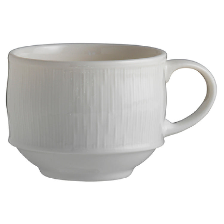 The Steelite 62104ST1042 Cup is a meticulously designed piece of drinkware that combines functionality with a sophisticated aesthetic. With a 10 oz. capacity, this cup measures 3-1/2 inches in width and stands 4-3/4 inches tall, conveniently equipped with a handle for ease of use in any setting. Its stackable design ensures efficient storage, making it a practical choice for both high-volume hospitality environments and intimate dining settings. The cup features an embossed surface that adds a touch of elegance and a unique texture. Constructed from Maxadura porcelain, a form of Royal Porcelain, this cup is engineered to withstand the rigors of daily use. Its scratch and mark resistant glaze contributes to its durability, maintaining its pristine appearance over time. As a stock item, the Steelite 62104ST1042 Cup provides reliable availability, packaged conveniently in cases of three dozen, catering to the needs of large-scale operations. From bustling cafes to refined dining establishments, this cup's combination of style, durability, and storage efficiency makes it a versatile choice across various market segments in the food service industry.