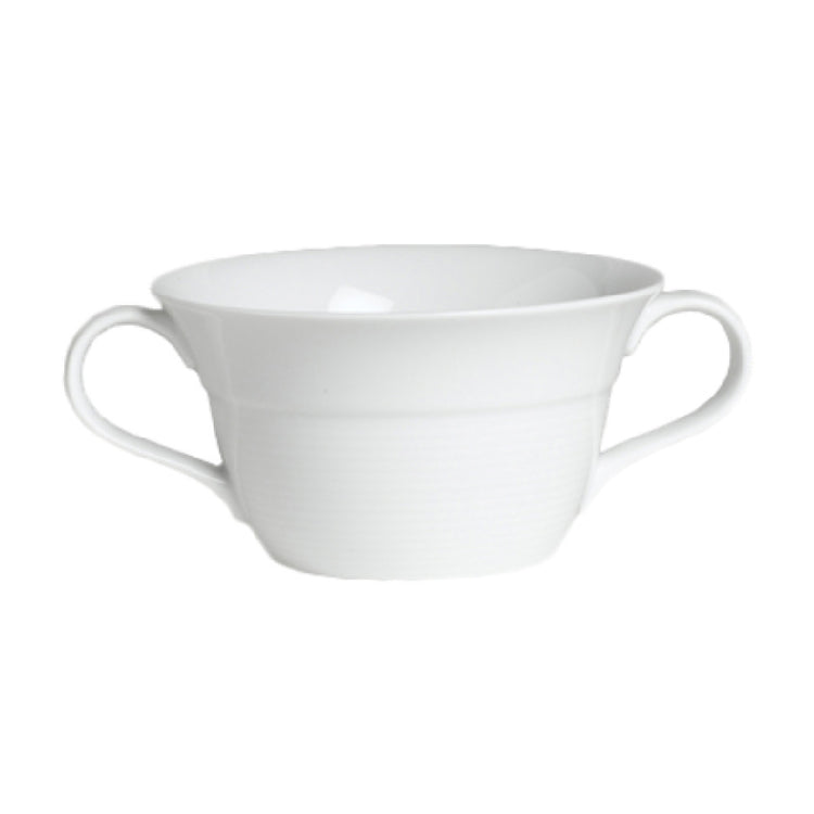 The Steelite 6300P064 Cream Soup 10 Oz. 4-3/4" Dia. is a masterfully crafted piece of porcelain dinnerware from the Rene Ozorio Aura collection, distinguished by its elegant round shape and dual-handle design. This product is specifically engineered for serving cream soups and boasts a capacity of 10 ounces, making it an ideal choice for both high-end restaurants and casual eateries aiming to enhance their dining presentation. The two-handle feature not only adds a touch of sophistication but also improves functionality, making it easier for servers and diners to handle hot contents safely. With a diameter of 4-3/4 inches, this non-stock item is sizable enough to accommodate a generous portion, yet compact enough to fit seamlessly into any table setting. Packed in cases of two dozen, it is a practical choice for establishments requiring durable and stylish porcelain that can withstand the rigors of frequent use. Steelite's commitment to quality is evident in the meticulous design and construction of this piece, which is well-suited for any dining environment looking to combine utility with aesthetic appeal.