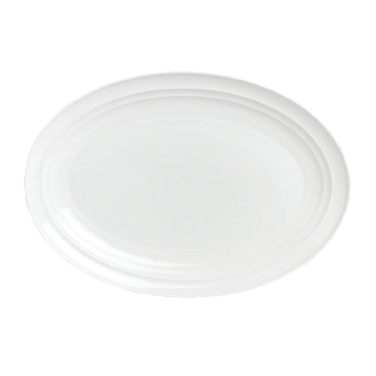 The Steelite 6300P112 Platter 14" Oval is an exceptional piece of serveware crafted for both style and functionality in diverse dining settings. This oval platter, with a size of 14 inches, is ideally suited for presenting a variety of dishes, from gourmet entrees to elegant buffet displays. It features a narrow rim design, enhancing its visual appeal while maximizing the surface area for plating. Constructed from high-quality porcelain, the platter embodies durability and a classic aesthetic that complements any table setting. Part of the Rene Ozorio Aura collection, this platter is not only a stock item but also a testament to refined design and practical usability. Available in cases of six, it caters to the needs of restaurants, hotels, and catering services that require reliable and elegant serveware solutions. The Steelite 6300P112 Platter harmoniously balances aesthetic value with the resilience needed for commercial use, making it a favored choice in the hospitality industry. Its distinctive blend of style and practicality underscores its role as a versatile, must-have piece for any establishment aiming to elevate their dining presentation.