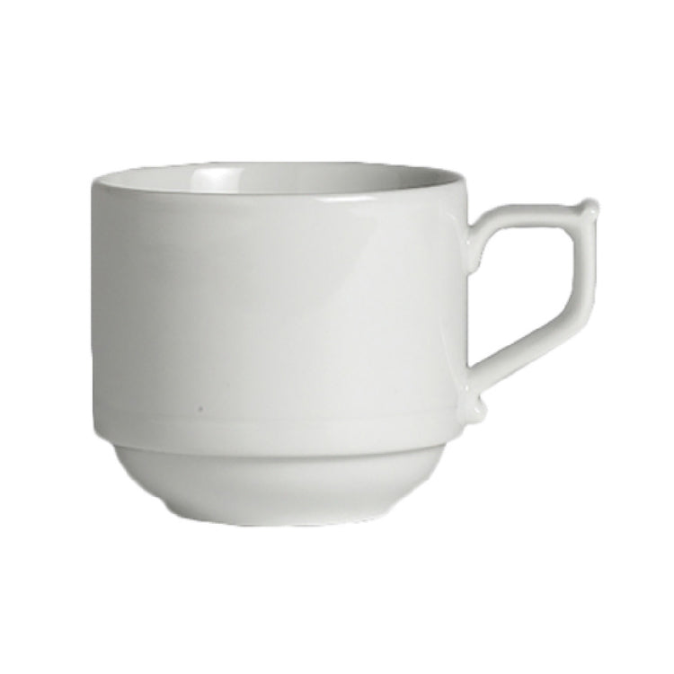 The Steelite 6306P770 Coffee Cup is a high-quality porcelain beverage container integral to the Rene Ozorio Concerto collection. With a capacity of 6-3/4 ounces, this coffee cup offers a perfect balance between size and elegance, catering to the needs of both casual and fine dining establishments. Measuring 4-1/8 inches in width and 2-5/8 inches in height, it presents a sleek, stackable design that maximizes space efficiency, making it a practical choice for bustling cafes, restaurants, and hospitality services. Steelite International has engineered this model to meld style with functionality, ensuring it can withstand the rigors of constant use while maintaining its pristine appearance. Sold in cases of 24, the Steelite 6306P770 is a stock item, allowing for seamless integration into any dining setting. This coffee cup's durable porcelain construction enhances its resilience and longevity, making it a reliable choice for any business within the food service industry. Its elegant design and robust nature make it suitable for a variety of market segments, from upscale dining to fast-paced cafes, demonstrating its versatility and universal appeal. The Steelite 6306P770 Coffee Cup is an exemplary piece that combines aesthetic finesse with practical design, ideal for diverse dining environments.