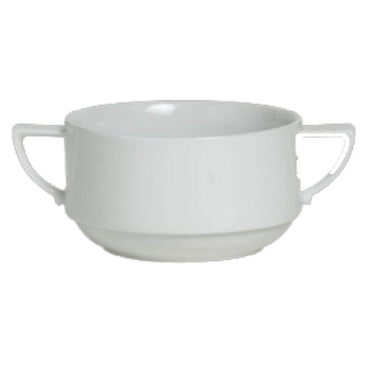 The Steelite 6314P1040 Bouillon Cup is a meticulously crafted piece of porcelain ware designed by Rene Ozorio, under their Sonata collection. It has a capacity of 12-3/4 oz., making it an ideal choice for serving soups, stews, and various bouillons. Measuring 6-1/4 inches in diameter and 2-3/8 inches in height, this cup balances size and functionality, catering to different dining settings, from upscale restaurants to casual cafes. The bouillon cup features a handled design, enhancing ease of use and comfort, while its stackable nature ensures efficient storage and space management in busy kitchen environments. Though a non-stock item, it is packed by 2 dozen per case, aligning with the needs of high-volume food service operations. The Steelite 6314P1040 Bouillon Cup combines elegance with practicality, providing a durable and aesthetically pleasing solution for culinary presentations. Its porcelain construction not only offers a touch of sophistication but also ensures longevity and resistance to wear, making it a valuable addition to any dining establishment looking to elevate their service ware collection with distinctive and high-quality pieces.