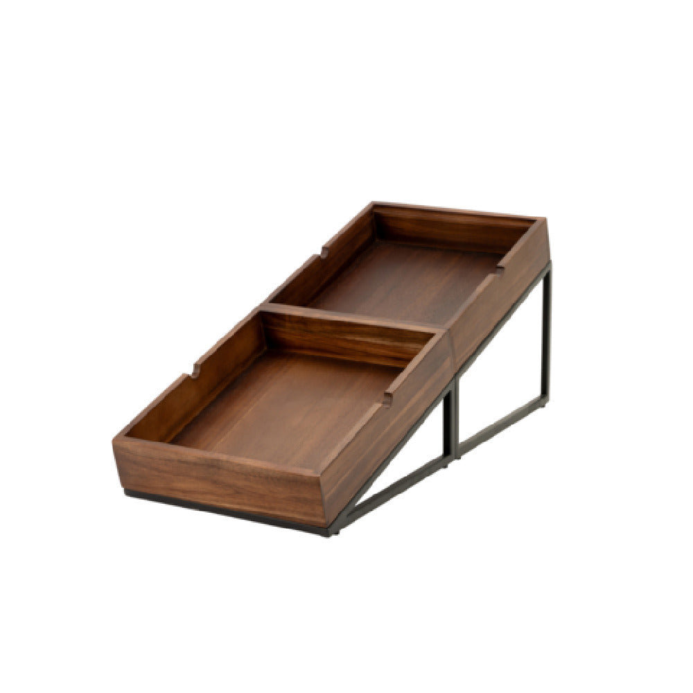 The Steelite 7363MW341 Riser is a meticulously designed piece measuring 13-7/8" x 11-1/2" x 8-1/2" and features an angled structure, offering a unique aesthetic and functional proposition. Crafted from durable metal and finished in a pivot black color, this riser stands out in its category, presenting a modern and sleek appearance suitable for various professional environments. This product is a STOCK item and is packed by 1 each per case, ensuring ease of acquisition and integration into existing setups. The design is attributed to DW Haber, known for quality and innovation in metal products. The Steelite 7363MW341 is ideal for different segments within the industry, providing a versatile solution for display and organizational needs. Its unique design and construction make it an essential for businesses seeking to enhance their display capabilities with a reliable and stylish option. The minimum purchase is set at case quantity, emphasizing its availability for commercial purposes. Its distinctive design and practical dimensions cater to the sophisticated needs of the hospitality sector, offering both functionality and aesthetic appeal.