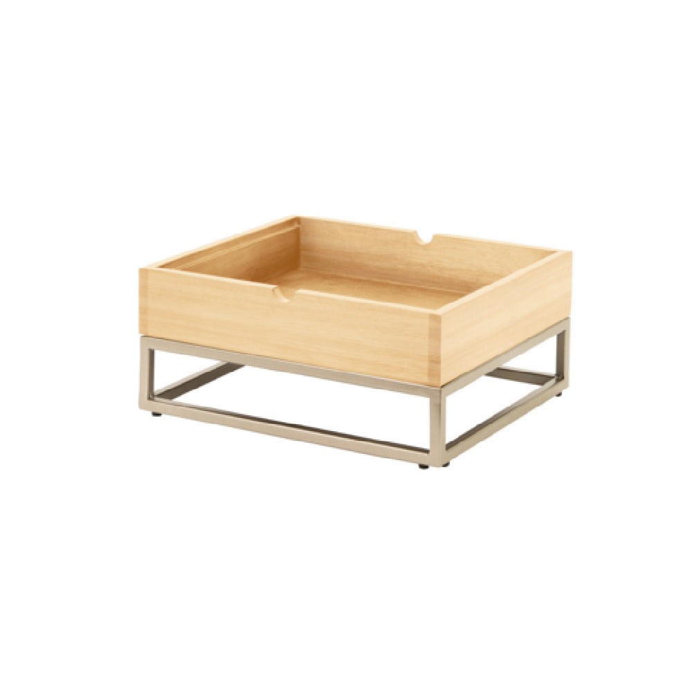 The Steelite 7364MW336 Riser is a distinct and functional piece, measuring 11-1/2 inches by 13-7/8 inches with a height of 3 inches, designed in a rectangular shape. Crafted from metal with a pivot champagne finish, this riser is a unique addition from Steelite International, emphasizing both durability and style. The product's unique metal composition and design make it suitable for various industry segments, such as hospitality, catering, and event management, where it can be used to elegantly elevate dishes or displays. Additionally, the Steelite 7364MW336 is part of the DW Haber collection, a noteworthy detail for those familiar with this renowned brand. Packaged with a minimum case quantity of one per case, this stock item ensures availability and readiness for immediate use. Its robust construction and stylish appearance provide an attractive platform for showcasing culinary creations, adding a touch of sophistication to any presentation. The Steelite 7364MW336 Riser's combination of functionality and aesthetic appeal makes it a versatile choice for professionals seeking to enhance their service with a reliable and visually appealing solution.