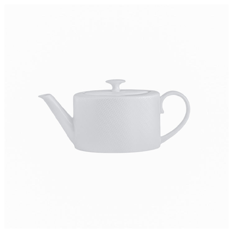 Steelite International, 82132AND0337, Oval Teapot, 19.375 oz, 9.25" x 3.75" x 3.5", Lahari, William Edwards, Oval, Bone China, Composed of classic and contemporary shapes, the Lahari Collection radiates a minimalist yet sophisticated design that gently orchestrates an impressive stage for culinary excellence. A delicate wave-like pattern proudly adorns each piece, offering a lustrous shimmer through a raised white mica that effortlessly coordinates a desired dining experience. Ideal for banqueting and upscale catering, Lahari presents a fresh and timely appeal for both contemporary and traditional dining rooms. (minimum = case quantity, 6 each per case) (STOCK item) (Packed By: Cs)