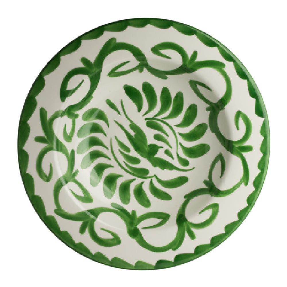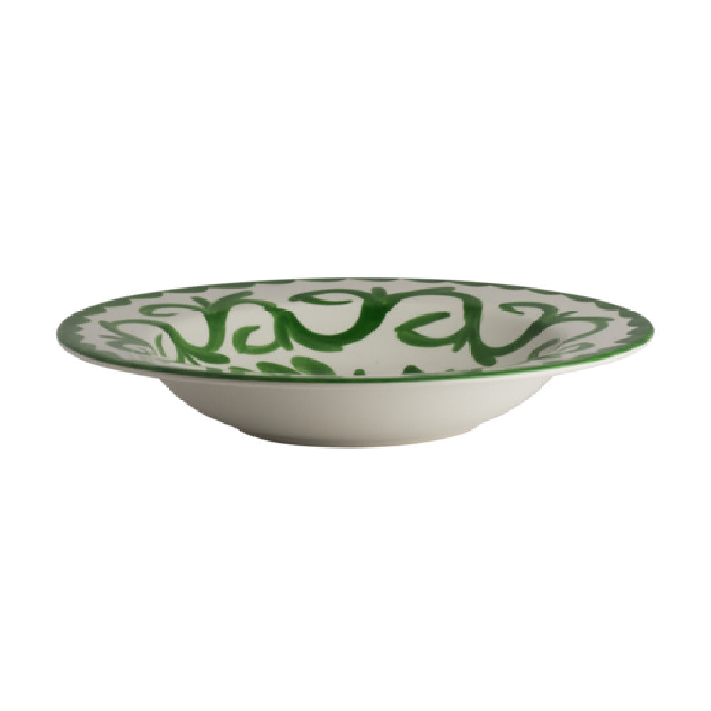 The Steelite A124P050 Pasta Bowl is a meticulously crafted piece of dining ware, boasting a generous capacity of 26 ounces and dimensions of 11-3/4 inches in diameter and 2-1/4 inches in height. This round bowl is not just a functional item but an artistic expression, as it is hand painted with care. Made from fully vitrified china, it promises durability and a refined aesthetic that enhances any culinary presentation. This particular model falls under the Anfora line, specifically featuring the Puebla Palm design, which adds a unique and stylish flair suited for both casual and fine dining establishments. Despite being a non-stock item with a minimum order requirement of 300 pieces, it is conveniently packed by the dozen, ensuring that businesses can easily integrate it into their inventory. The Steelite A124P050 Pasta Bowl is perfect for restaurants, caterers, and hospitality services seeking to elevate their dining experience with high-quality, aesthetically pleasing serving ware. Whether used for serving pasta or other culinary creations, this bowl's design and construction make it a versatile choice for industry professionals who value both form and function in their service offerings.
