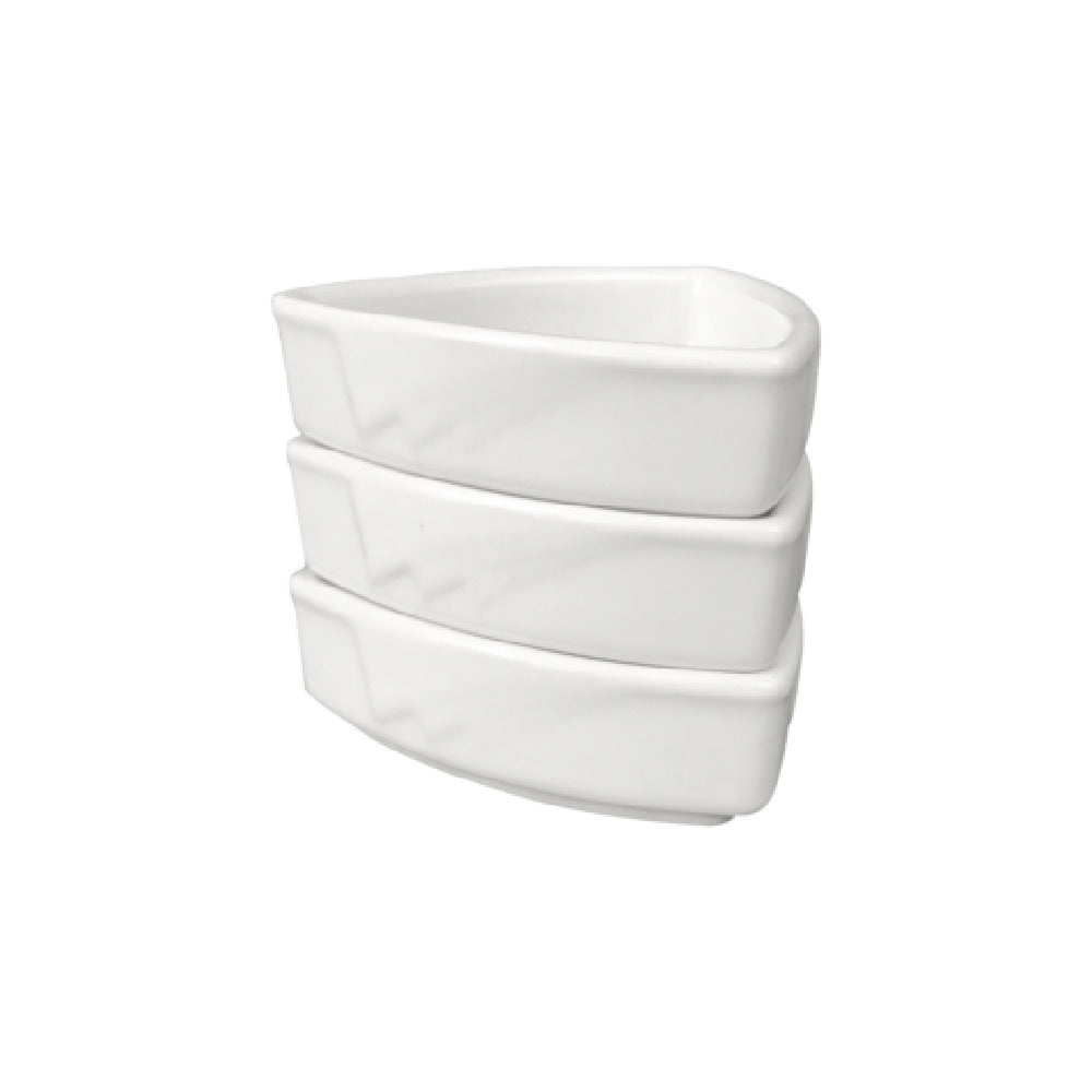 The Steelite DCI357PW Ramekin 2 Oz. 3-1/2" X 3-1/2" X 1-1/8"H is a versatile and essential item for any culinary setting, including restaurants, catering services, and home kitchens. With its precise dimensions of 3-1/2 inches by 3-1/2 inches and a height of 1-1/8 inches, this ramekin is designed to hold a capacity of 2 ounces, making it perfect for serving individual portions of sauces, dips, or desserts. Crafted in a triangular shape, it presents a unique visual appeal that complements modern table settings. The ramekin is made from fully vitrified ceramic, ensuring enhanced durability and resistance to chipping. Its Polar White hue provides a classic and clean presentation, suitable for any dish or occasion. Furthermore, this ramekin is lead-free, aligning with safety standards for food service. It is both oven and microwave safe, offering convenience and flexibility in food preparation and serving. The Steelite DCI357PW is available as a stock item, packaged in cases containing three dozen units, catering to the needs of large-scale service environments. This product embodies a blend of practicality and aesthetic sophistication, making it a valuable addition to any culinary establishment.