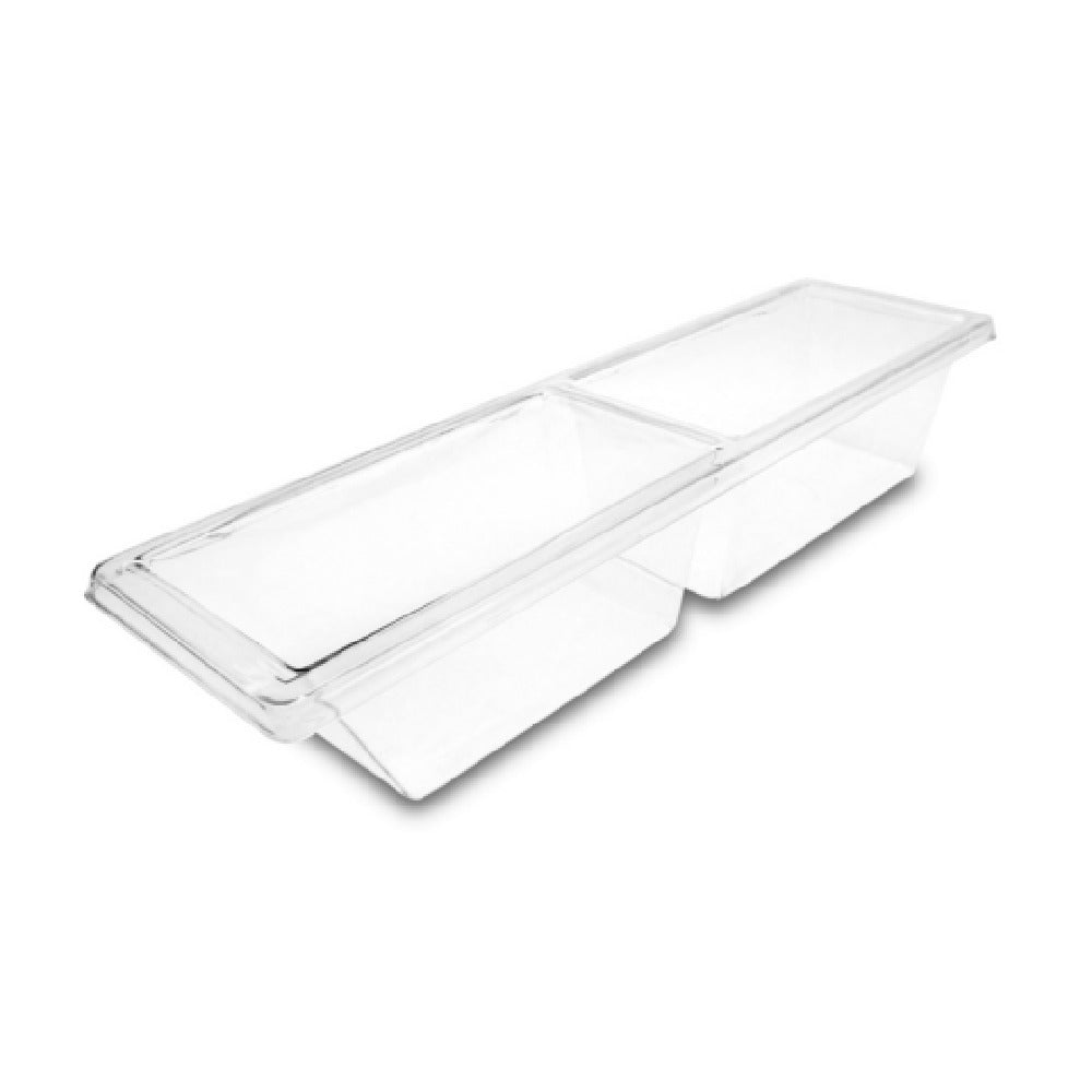 The Steelite DFBFB2711D204 Food Bin is a versatile storage solution designed for diverse food service environments, measuring 27 inches in width, 11 inches in depth, and 5 inches in height. With a capacity of 5 gallons, this rectangular bin is crafted from durable PETG Plastic, ensuring a clear, resilient construction that withstands the demands of busy supermarkets and food establishments. Featuring two compartments, it provides organized storage, allowing for efficient separation and accessibility of food items. The material choice of PETG Plastic enhances its usability by offering clarity and resistance to impact, making it an ideal choice for environments requiring durability and visibility. Its rectangular form factor allows for optimal space utilization, fitting seamlessly into various shelving configurations. As a STOCK item, it is available in case quantities, with each case containing four units, reflecting its practicality for bulk purchasing by food service operators. The Steelite DFBFB2711D204 Food Bin's thoughtful design and material selection make it a valuable asset for supermarkets and food establishments seeking reliable and clear storage solutions, balancing capacity with structural integrity to support diverse organizational needs in the food service industry.