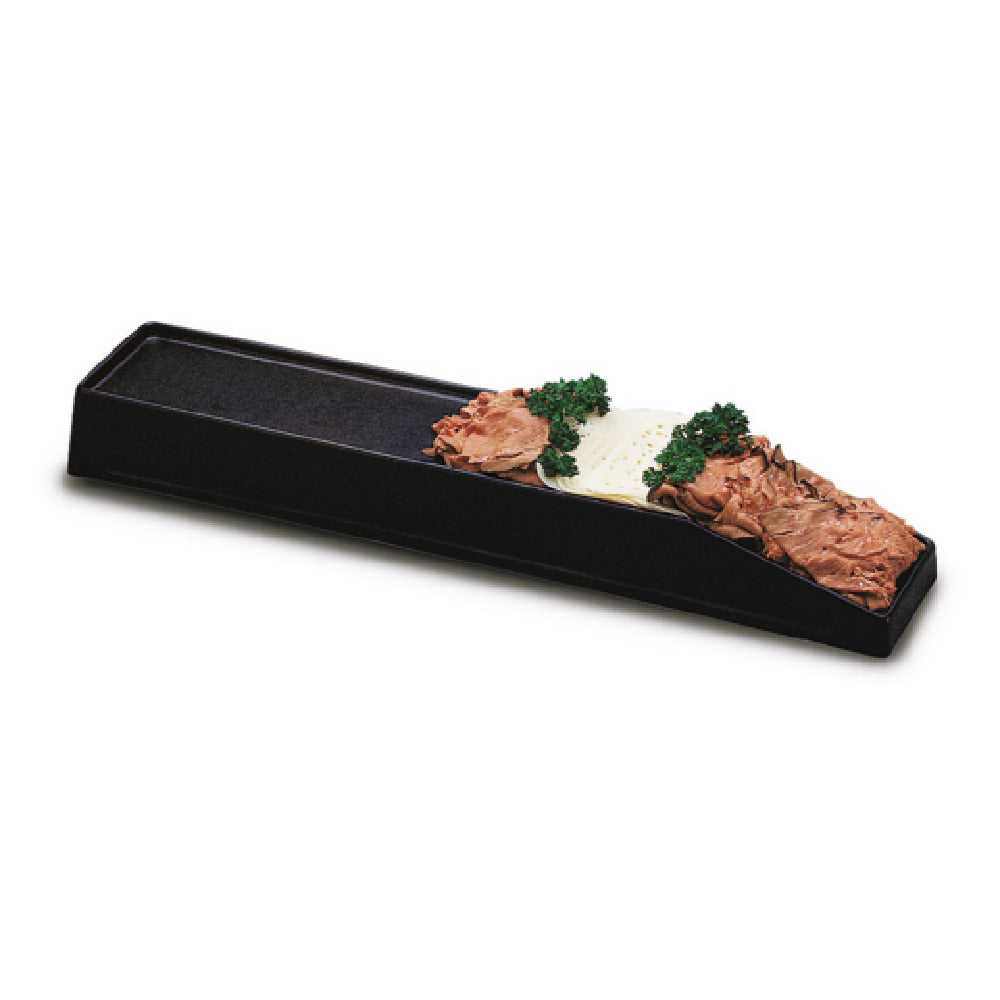 The Steelite DFMR30817 Meat Riser is a practical and stylish solution for displaying meats in a variety of settings. Measuring 30 inches wide, 8 inches deep, and 3-1/2 inches high, this rectangular riser is specifically designed to enhance the presentation of meat products. Crafted from durable black ABS plastic, it is robust and lightweight, ensuring ease of handling and longevity. The riser's construction supports its function as a reliable fixture in environments such as supermarkets, where visual appeal and efficient use of space are paramount. As a stock item, it is conveniently packed by case with a minimum quantity of four per case, facilitating bulk purchases for large-scale operations. Ideal for use in retail but also adaptable for other markets within the food industry, it provides a versatile platform that can be integrated into various display setups. The Steelite DFMR30817 Meat Riser not only contributes to a professional aesthetic but also serves as a functional component for optimized merchandising strategies.