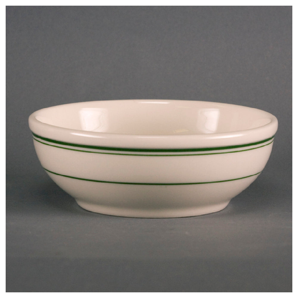 The Steelite HL1951 Nappy 14 Oz. 5-5/8" is a practical and versatile dish that combines both functionality and subtle design elements, specifically tailored for various segments within the food service industry. The dish has a volume capacity of 14 ounces, making it ideal for serving side dishes, desserts, or appetizers. With a diameter of 5-5/8 inches, it offers ample space to showcase culinary creations while maintaining a compact size suitable for efficient plating and presentation. The round shape contributes to its classic and timeless aesthetic, while the rolled edge adds durability and a touch of elegance that enhances its appeal. The distinct Green Band design adds a refined accent that can complement a range of table settings and themes. As a stock item, it is readily available and packed by 3 dozen per case, making it a convenient option for establishments requiring bulk purchases. Steelite International's commitment to quality is evident in this product, which is designed to meet the demands of busy restaurants, catering services, and hospitality venues. Its blend of functional size, durable construction, and subtle design makes the Steelite HL1951 Nappy an excellent choice for professionals seeking reliable and stylish tableware.