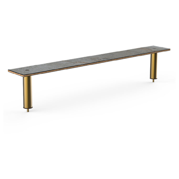 The Steelite MGCIAF04GBXX Mogogo Buffet Solutions Modular Classic Shelf is an expansive 71" x 9-1/2" x 12-1/2"H piece designed to enhance buffet presentations across various industry segments, including hospitality, catering, and event management. This large, rectangular shelf is engineered for use with basic, standard, and classic tables, offering versatility in its application. The shelf's construction features a grey slate BHP high-pressure laminate surface, which ensures durability and a modern aesthetic, while its bamboo core top adds a touch of natural elegance, making it a distinctive element in any setup. The inclusion of brushed brass segments not only provides structural integrity but also enhances the visual appeal, aligning with upscale presentation standards. Packed individually, this modular classic shelf caters to establishments that prioritize both functionality and style, offering a robust solution for organizing and displaying culinary creations in a sophisticated manner. Whether for a bustling hotel buffet or an elegant banquet setting, the Steelite MGCIAF04GBXX is poised to deliver reliable performance and a premium look, supporting the operational needs and aesthetic preferences of diverse market segments within the food service industry.