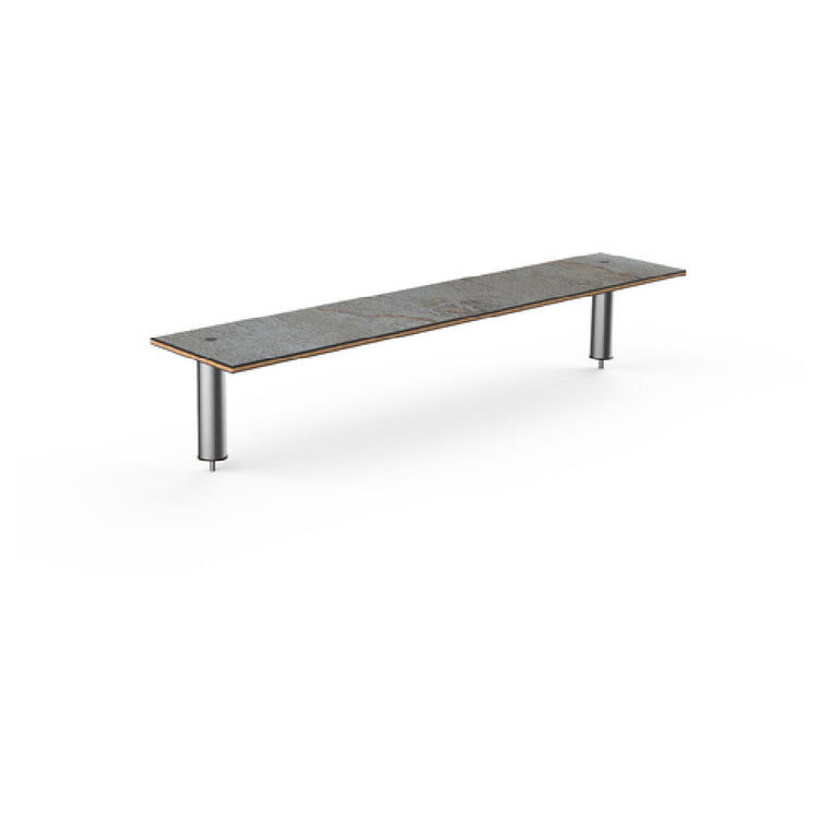 The Steelite MGCIAF06GSXX Mogogo Buffet Solutions Modular Classic Bar Shelf is a meticulously designed accessory perfect for enhancing buffet presentations. Measuring 71 inches in length, 14-1/2 inches in width, and 12-1/2 inches in height, this large, rectangular shelf is engineered to complement both basic and classic tables. It is crafted with a grey slate high pressure laminate top that features a bamboo core, ensuring durability and an attractive finish. The long brushed stainless steel segments contribute to its sleek appearance, providing a modern yet timeless appeal. This bar shelf is packed individually, making it a versatile addition to various segment markets within the hospitality and catering industry. Its modular design allows for adaptability, making it an essential component for creating dynamic and customizable buffet setups. The combination of high-quality materials and thoughtful construction ensures that the Steelite MGCIAF06GSXX Mogogo Buffet Solutions Modular Classic Bar Shelf is not only a practical choice but also an elegant one, suitable for establishments that prioritize both functionality and aesthetics.