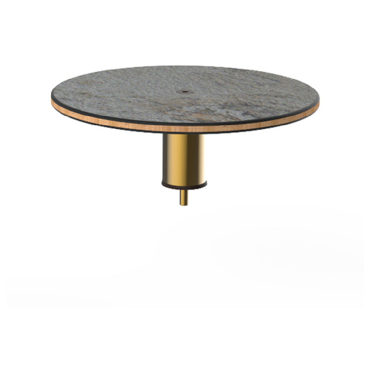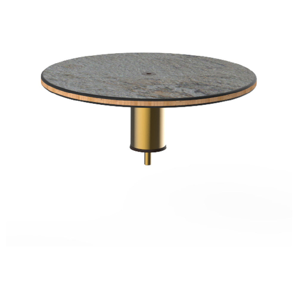 The Steelite MGCIAY06GBXX Mogogo Buffet Solutions Modular Display Shelf is a sophisticated piece of buffet architecture, distinguished by its 18-inch diameter and 6-1/2-inch height. This low, round shelf is meticulously crafted to cater to the aesthetic and functional demands of diverse market segments within the hospitality industry. Its surface is made from gray slate BHP high pressure laminate, known for its durability and resistance to wear, making it an ideal choice for high-traffic catering environments. Beneath the laminate lies a bamboo core top, offering a unique blend of sustainability and strength. The inclusion of a brushed brass segment adds a touch of elegance and modernity, making it suitable for upscale events and venues. Each unit is packed individually, ensuring careful handling and optimal preservation of its pristine condition. This modular display shelf is part of the Mogogo Buffet Solutions line, known for its innovative and versatile designs that allow for creative buffet setups, enhancing the presentation and service experience. The Steelite MGCIAY06GBXX serves as a reliable and stylish component, adaptable to various settings, from casual dining to luxurious banquets, fulfilling both functional and decorative purposes with precision and grace.