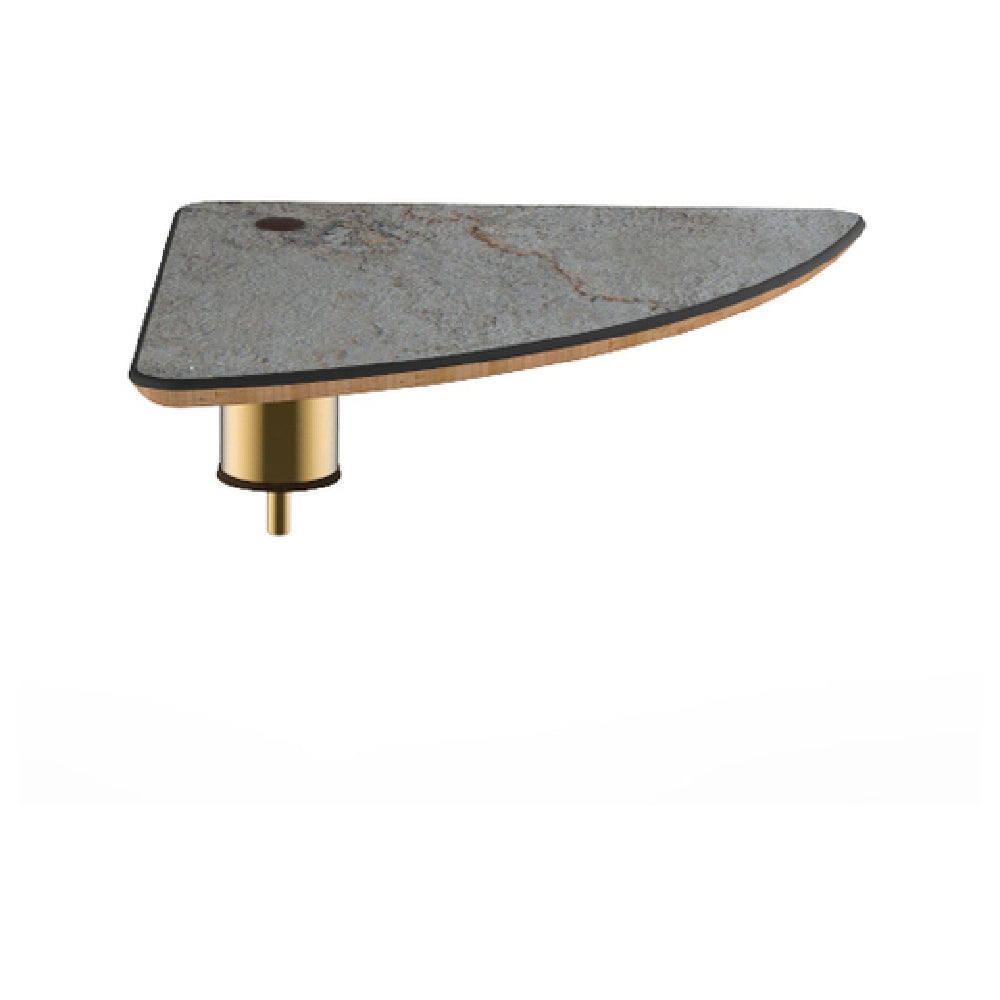 The Steelite MGCIAY10GBXX Mogogo Buffet Solutions Modular Display Shelf is a uniquely designed piece that measures 17" x 17" x 6-1/2"H, offering a large, low, triangular shape that sets it apart within the buffet display market. This display shelf is crafted with a grey slate BHP high-pressure laminate surface, which is enhanced with a bamboo core top, providing both durability and an aesthetic appeal. The bamboo core not only adds strength but also complements the brushed brass segment that acts as a stylish accent. Packed as one unit, this modular display shelf is ideal for various segments within the hospitality industry, including catering services, hotels, and event venues looking to create sophisticated and flexible buffet presentations. Its modularity allows for creative arrangement possibilities, enabling users to tailor their service settings to different event themes and spatial requirements. The Steelite MGCIAY10GBXX combines practicality with elegance, making it an essential component for modern buffet solutions, where functionality and style are paramount.