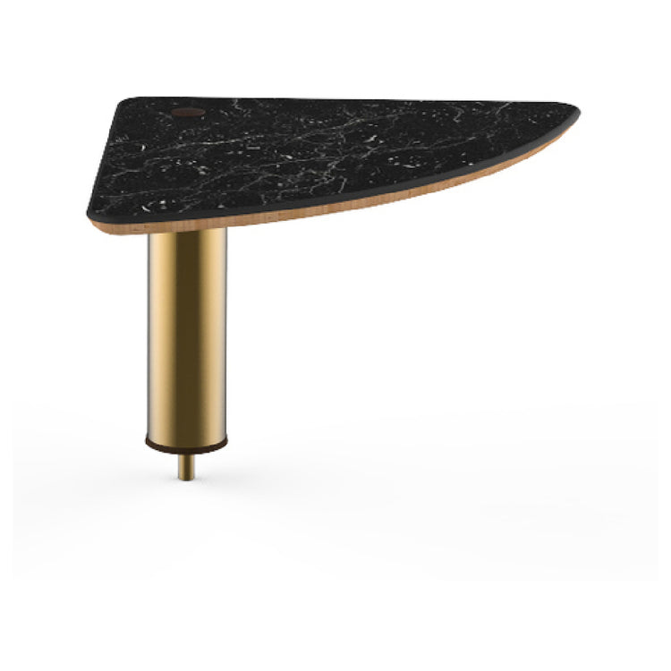 The Steelite MGCIAY12MBXX Mogogo Buffet Solutions Modular High Display Shelf is a cutting-edge display solution designed for versatility and elegance in any buffet setting. Measuring 17 inches by 17 inches with a height of 12-1/2 inches, this large, triangular shelf is crafted to enhance the visual appeal of food presentations. The shelf features a Nero Marquina marble BHP high-pressure laminate with a bamboo core top, combining durability with a luxurious finish that is perfect for high-end catering environments. The inclusion of a brushed brass segment further elevates the shelf's aesthetic, reflecting sophisticated design sensibilities. This modular shelf is especially valuable for venues seeking to create dynamic and customizable buffet displays, allowing for the seamless integration and arrangement of various food items. By utilizing high-quality materials, the Steelite MGCIAY12MBXX ensures a durable and stable platform for showcasing culinary creations, making it an ideal choice for hotels, restaurants, and event spaces aiming to impress their guests. Each unit is meticulously packed, ensuring that it arrives in pristine condition, ready to be incorporated into a variety of settings. This display shelf embodies the perfect blend of form and function, offering a distinctive solution for modern buffet arrangements.