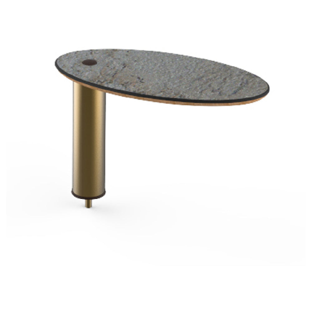 The Steelite MGCIAY16GBXX Mogogo Buffet Solutions Modular High Display Shelf is a versatile and elegant addition to any buffet presentation, measuring 20" x 10" x 12-1/2"H. This large, oval display shelf is crafted with a grey slate BHP high-pressure laminate surface, offering a striking visual appeal combined with durability. The bamboo core top enhances its eco-friendly profile while providing a lightweight yet sturdy foundation for displaying a variety of items. Complementing the modern design, the shelf features a brushed brass segment, adding a touch of sophistication and luxury to any setting. Packed by each, this modular high display shelf is especially beneficial for catering professionals, event planners, and hospitality venues looking to elevate their presentation with a stylish, high-quality display solution. Its modular nature allows for customizable arrangements, making it adaptable to different spatial needs and aesthetic preferences within the industry. The Steelite MGCIAY16GBXX shelf effectively balances form and function, making it an ideal choice for those seeking to impress with both performance and design excellence.