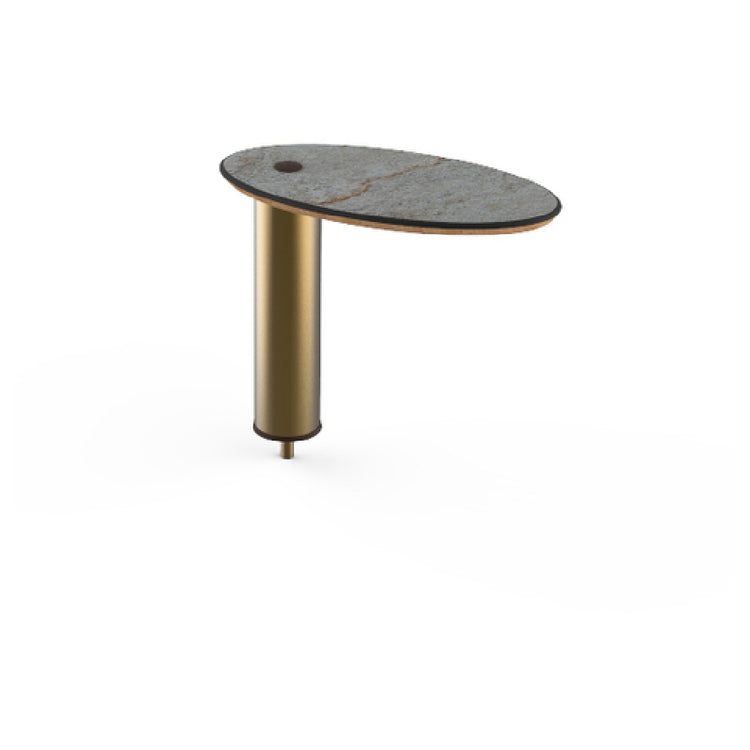The Steelite MGCIAY17GBXX Mogogo Buffet Solutions Modular High Display Shelf 16" X 8" X 12-1/2"H stands out as a meticulously crafted piece, tailored to enhance buffet presentations within the hospitality industry. This display shelf is small, oval-shaped, and measures 16 inches in length, 8 inches in width, and 12-1/2 inches in height, making it an adaptable addition to any buffet setup. The top surface features a grey slate BHP high-pressure laminate, reinforced by a durable bamboo core, which ensures longevity and aesthetic appeal. The shelf is accentuated with a brushed brass segment, adding a touch of elegance and sophistication, appealing to upscale dining settings and professional caterers. This product is typically packed individually, allowing for easy transportation and assembly. Its modular nature allows for flexibility in design and layout, catering to various market segments such as hotels, event venues, and catering companies looking for both functionality and style. The Steelite Mogogo Buffet Solutions Modular High Display Shelf offers a premium choice for showcasing culinary creations, emphasizing both quality and design innovation, making it a valuable asset for enhancing the visual appeal of dining environments.