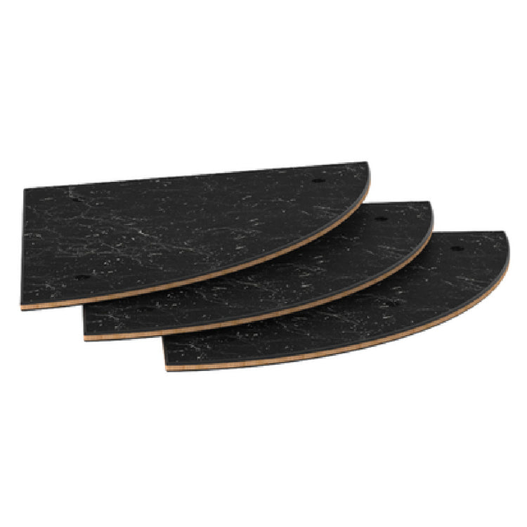 The Steelite MGCILX01MXXX Mogogo Buffet Solutions Modular High Display Shelf Set, measuring 29-1/2" x 29-1/2", is a versatile and elegant solution for showcasing buffet items in various hospitality settings. This triangular display shelf is constructed with a Nero Marquina marble BHP high pressure laminate, which is not only visually striking but also offers durability and a luxurious feel. The bamboo core top enhances its structural integrity and sustainability, appealing to eco-conscious businesses. Featuring a brushed stainless steel segment, this set combines modern aesthetics with robustness, making it suitable for high-traffic environments. Packed as a single set, its modular design allows for flexibility in presentation setups, catering to diverse needs within the foodservice industry. Whether used in upscale restaurants, hotels, or catering events, this display set elevates the presentation of culinary displays, providing a professional and polished look that enhances the dining experience. Its unique combination of materials and the practicality of modularity make this display shelf set an asset for establishments aiming to impress their clientele with both functionality and style.