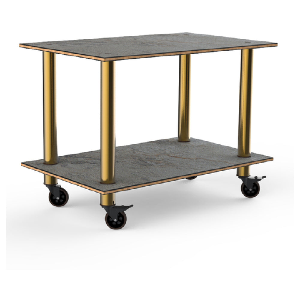 The Steelite MGCMDX02GBXW Mogogo Buffet Solutions Modular Serving Table is a sophisticated and versatile addition to any food service environment, featuring two tiers and dimensions of 47 inches in length, 29-1/2 inches in width, and 35 inches in height. This rectangular serving table comes in a medium size and showcases a grey slate BHP high-pressure laminate surface, which is further enhanced by a durable bamboo core top for added strength and elegance. The design is completed with brushed brass casters, facilitating smooth mobility and adaptability in various settings. Its knockdown construction enables easy assembly and disassembly, making it ideal for dynamic event setups and catering services. Steelite International has engineered this serving table to cater to diverse market segments within the hospitality industry, offering a blend of style and functionality that meets the demands of hotels, restaurants, and event planners. The Mogogo Buffet Solutions Modular Serving Table not only emphasizes aesthetic appeal but also provides practicality and durability, ensuring it is a valuable asset for food presentation and service. Packed by one each, this modular serving table represents a harmonious balance between innovative design and reliable performance, suitable for a wide array of culinary exhibitions and buffet setups.