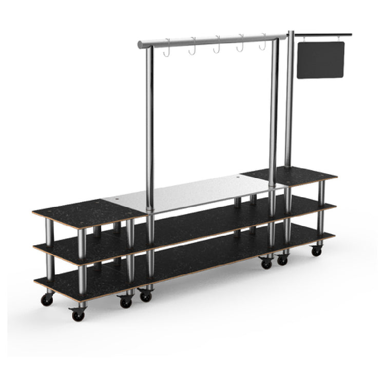 The Steelite MGCMLA02MSXW Mogogo Buffet Solutions Modular Pro Salsa Bar Station 3-tier is a versatile and sophisticated solution for buffet presentations. Measuring 130 inches by 29-1/2 inches by 96 inches in height, this rectangular station is engineered to enhance culinary displays across various settings. Its stainless steel workspace ensures durability and longevity, making it a reliable choice for high-traffic environments. The station includes a sign post and chalkboard, allowing for customizable labeling and seamless communication of menu items. The top is crafted from Nero Marquina marble BHP high pressure laminate with a bamboo core, providing an elegant yet durable surface that withstands the demands of professional use. The inclusion of brushed stainless steel casters facilitates easy mobility, enhancing flexibility in dynamic service areas. This self-contained unit is packed conveniently as one piece, simplifying setup and maintenance. Ideal for catering services, hotel buffets, or event venues, the Mogogo Buffet Solutions Modular Pro Salsa Bar Station combines functionality with aesthetic appeal, making it a standout choice for professionals seeking to elevate their buffet arrangements.