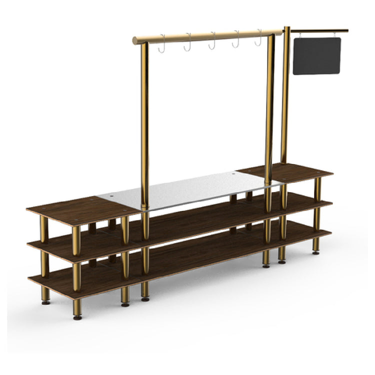 The Steelite MGCMLA02WBXF Mogogo Buffet Solutions Modular Pro Salsa Bar Station 3-tier is a meticulously designed piece tailored for sophisticated buffet presentations. With dimensions of 130" x 29-1/2" x 96"H, this rectangular station is an excellent fit for culinary environments requiring expansive serving spaces. The station features a stainless steel workspace, ensuring durability and a sleek appearance, advantageous in both aesthetic and functional capacities. The inclusion of a sign post and chalkboard allows for customizable signage, enhancing guest interaction and service personalization. The Bengali mango wood BHP high pressure laminate with a bamboo core top not only adds an element of elegance but also promises resistance to wear, ideal for high-traffic areas. Supported by brushed brass legs, the station offers stability and a touch of luxury. The knockdown design provides ease of assembly and transport, making it a versatile choice for various event settings. Each unit is packed individually, highlighting the attention to detail in handling and delivery. The Steelite MGCMLA02WBXF is an asset for upscale dining establishments and caters to diverse market segments within the hospitality industry, emphasizing quality, versatility, and innovative design.