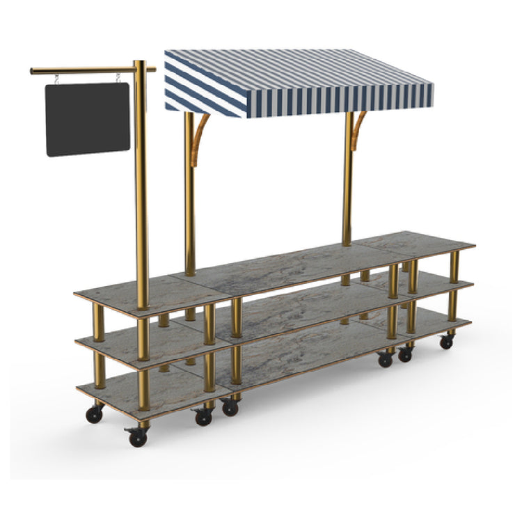 The Steelite MGCMLA03GBWW Mogogo Buffet Solutions Modular Pro Salsa Bar Station 3-tier is an innovative and versatile addition to any professional catering or food service environment. Measuring 130 inches in length, 29-1/2 inches in width, and 96 inches in height, this rectangular salsa bar station is designed to maximize both display and functionality. It features a distinctive grey slate BHP high-pressure laminate with a bamboo core top, providing a durable and aesthetically pleasing surface. The station is further enhanced by a white/blue canopy, adding a touch of elegance while offering protection for food items. The inclusion of a sign post and chalkboard allows for easy labeling and customization, enhancing the user experience. Equipped with brushed brass casters, this station guarantees mobility and ease of placement, making it adaptable to various event layouts. The knockdown design ensures convenient assembly and disassembly, facilitating transportation and storage. Packed by one each, the Steelite MGCMLA03GBWW is a practical solution for buffet-style setups, catering to the needs of hotels, restaurants, and event venues seeking a modular, high-quality service station for their culinary presentations.