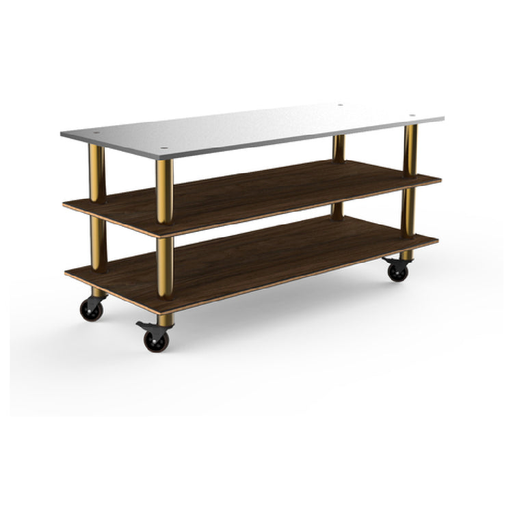 The Steelite MGCMLA05WBXW Mogogo Buffet Solutions Modular Pro Station is an expertly designed buffet station that caters to the diverse needs of professional food service environments. This 3-tier rectangular unit measures 71 inches by 29-1/2 inches by 33 inches high, providing ample space for displaying a wide variety of dishes. The standout feature of this product is its stainless steel top surface, offering a durable and easy-to-clean workspace. The station is further enhanced by the Bengali mango wood BHP high-pressure laminate, which includes a bamboo core top, adding a touch of elegance and sustainability to its design. Equipped with brushed brass casters, the unit ensures easy mobility, making it ideal for dynamic kitchen settings or events requiring frequent layout changes. The knockdown design of the station allows for convenient assembly and disassembly, catering to spaces with limited storage options. While the unit comes without covers, it arrives packed in a single unit, streamlining the setup process. The Steelite MGCMLA05WBXW is a versatile solution for hotels, catering services, and banquet halls looking for a sophisticated and practical buffet setup that complements their culinary presentations.