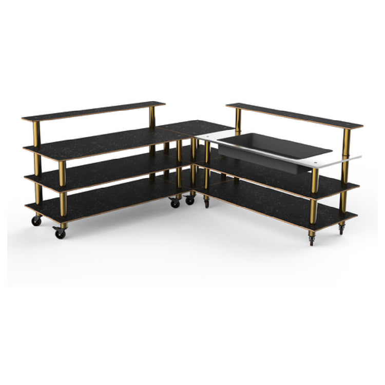 The Steelite MGCMLB01MBXW Mogogo Buffet Solutions Modular Cooling Corner Station 3-tier is an impressive piece of equipment measuring 100-1/2" x 100-1/2" x 47-1/2"H. It features a robust rectangular design with a stainless steel top, ensuring durability and a sleek appearance. This cooling station includes an insulated ice bin, which is integral for maintaining optimal temperatures for buffet presentations. Additionally, the unit is designed with two back shelves, offering ample storage space for various items. The top surface boasts a Nero Marquina marble BHP high pressure laminate with a bamboo core, combining aesthetic appeal with functional resilience. The brushed brass finish adds a touch of elegance, making it suitable for upscale dining environments. This cooling corner station is packed by one each, ensuring it arrives ready for immediate integration into your buffet setup. Ideal for catering services, luxury hotels, and high-end restaurants, the Steelite MGCMLB01MBXW Mogogo Buffet Solutions Modular Cooling Corner Station provides a versatile and sophisticated solution for displaying and preserving chilled food items in style.