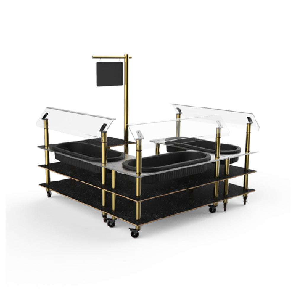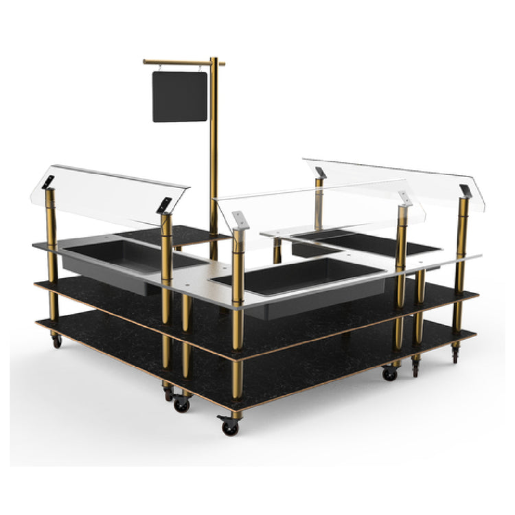 The Steelite MGCMLB03MBXW Mogogo Buffet Solutions Modular Chilled Salad Station 3-tier is a sophisticated addition to any self-service dining environment. Measuring an impressive 100-1/2 inches by 100-1/2 inches by 94-1/2 inches in height, this rectangular station is designed to meet the demands of large-scale hospitality settings. Its unique three-tier design, featuring three stainless steel tops with insulated ice bins, ensures that salads and other chilled items remain fresh and appetizing. The inclusion of three breath guards enhances food safety by providing a barrier between the food and potential contaminants. Additionally, a sign post is integrated into the design, allowing for clear and effective communication of menu offerings or dietary information. Constructed with Nero Marquina marble BHP high-pressure laminate, this chilled salad station combines durability with a luxurious aesthetic. Ideal for use in hotels, event venues, and upscale catering services, the Steelite MGCMLB03MBXW offers a modular approach to buffet presentation, allowing for flexibility and customization in layout. Its robust construction and thoughtful features make it an invaluable asset for any business looking to elevate their buffet service with both functionality and style.