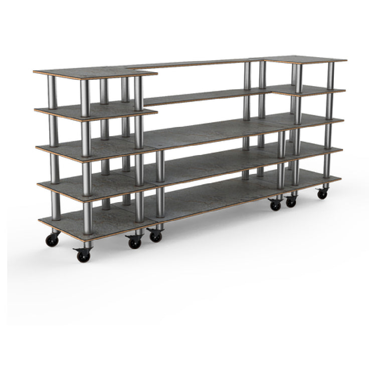 The Steelite MGCMLB04GSXW Mogogo Buffet Solutions Modular Bread & Pastries Station is an innovative and versatile unit designed for a variety of food service environments. This five-tier station measures 130 inches in length, 29-1/2 inches in width, and stands 60-1/2 inches high, providing ample space for displaying an array of bread and pastries. The rectangular design is aesthetically complemented by a grey slate BHP high-pressure laminate surface that is both durable and elegant, featuring a bamboo core top that adds a touch of natural beauty. The station is equipped with brushed stainless steel casters, ensuring easy mobility for dynamic buffet setups and efficient space management. The knockdown construction allows for convenient assembly and disassembly, making it a practical choice for events and catering services. Steelite International has crafted this station to meet the demands of high-traffic hospitality settings, offering a modular solution that caters to the needs of hotels, banquet halls, and catering businesses. The attention to detail and quality materials used in the construction of the Mogogo Buffet Solutions Modular Bread & Pastries Station underscore its functionality and aesthetic appeal, making it an excellent investment for professional culinary environments seeking flexibility and style in their buffet presentation.
